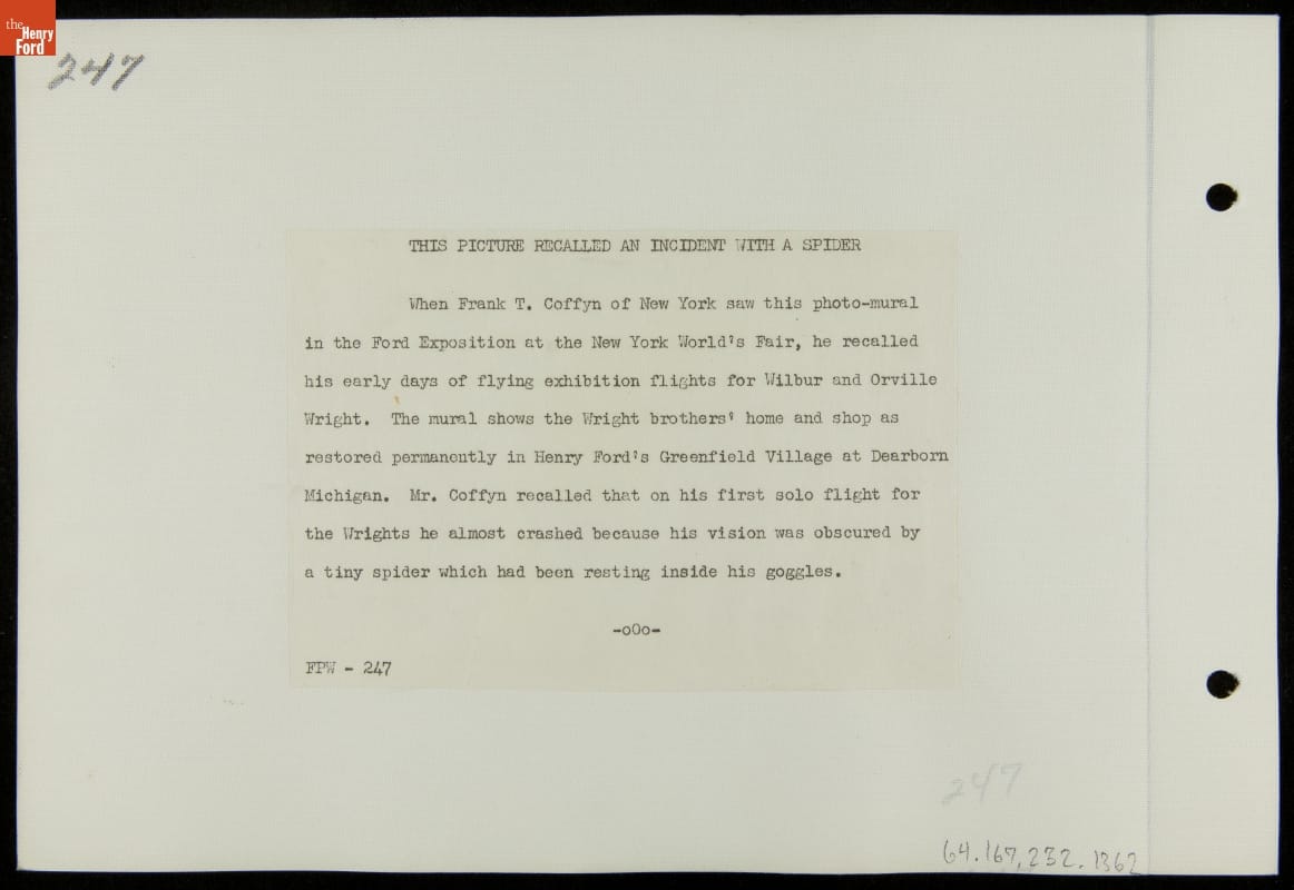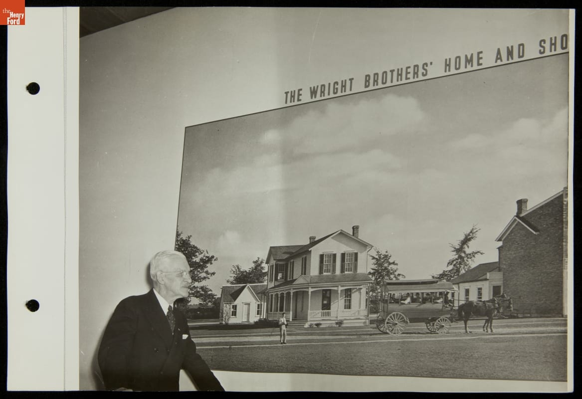 Ford Motor Company poured resources into the 1939-40 New York World's Fair, spending more than $5 million to construct and maintain its elaborate and well-attended exhibition space. Special guests numbered among Ford's 15 million reported exposition visitors. This photograph shows Frank Coffyn near a mural showing the home of fellow aviation pioneers, Orville and Wilbur Wright, at Henry Ford's Greenfield Village.