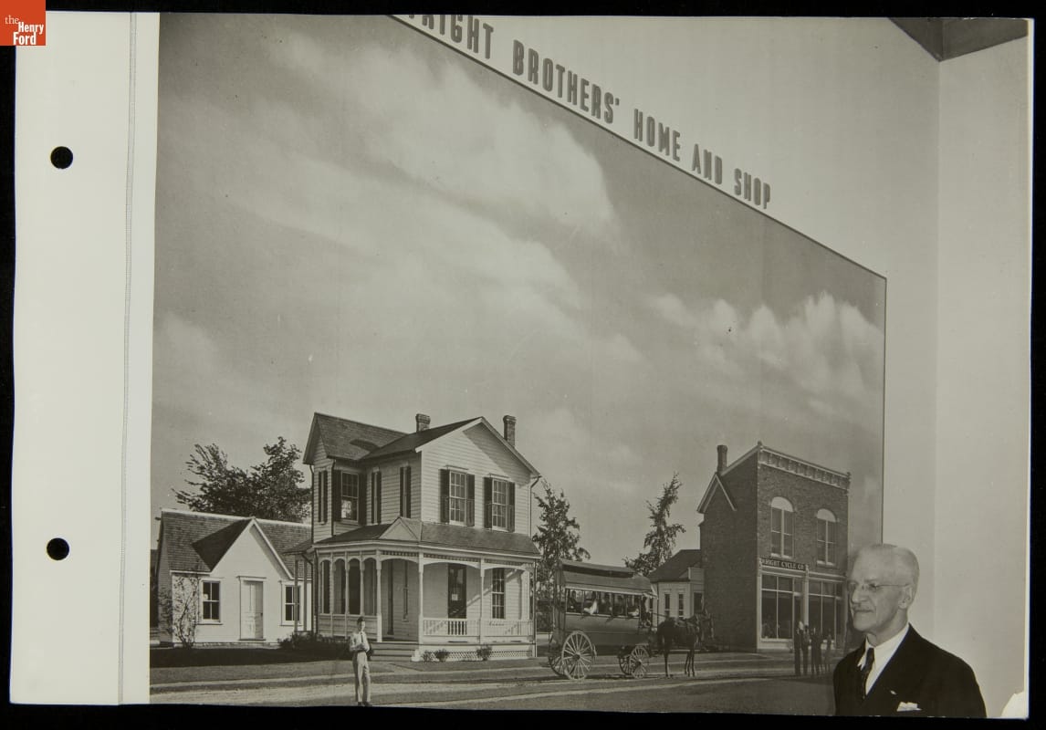 Ford Motor Company poured resources into the 1939-40 New York World's Fair, spending more than $5 million to construct and maintain its elaborate and well-attended exhibition space. Special guests numbered among Ford's 15 million reported exposition visitors. This photograph shows Frank Coffyn near a mural showing the home of fellow aviation pioneers, Orville and Wilbur Wright, at Henry Ford's Greenfield Village.