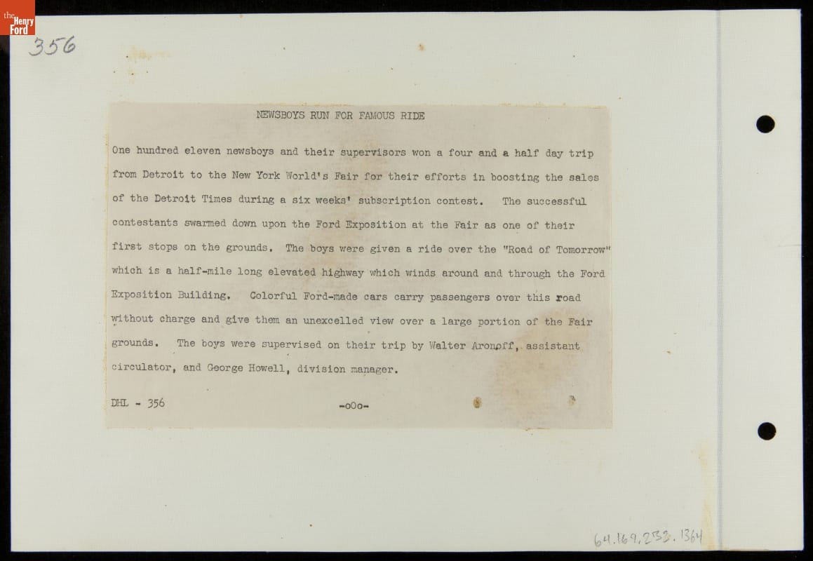Ford Motor Company poured resources into the 1939-40 New York World's Fair, spending more than $5 million to construct and maintain its elaborate and well-attended exhibition space. Ford hosted many special guests during the two-year event--including this energetic group of Detroit Times newsboys, who numbered among the reported 15 million fairgoers to visit the company's exposition.