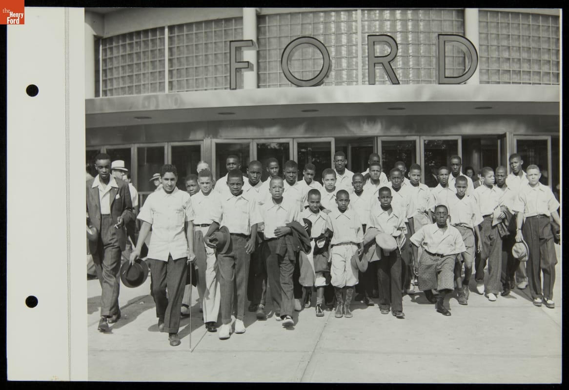 Ford Motor Company poured resources into the 1939-40 New York World's Fair, spending more than $5 million to construct and maintain its elaborate and well-attended exhibition space. Ford hosted many special guests during the two-year event--including this group of newsboys, who numbered among the reported 15 million fairgoers to visit the company's exposition.