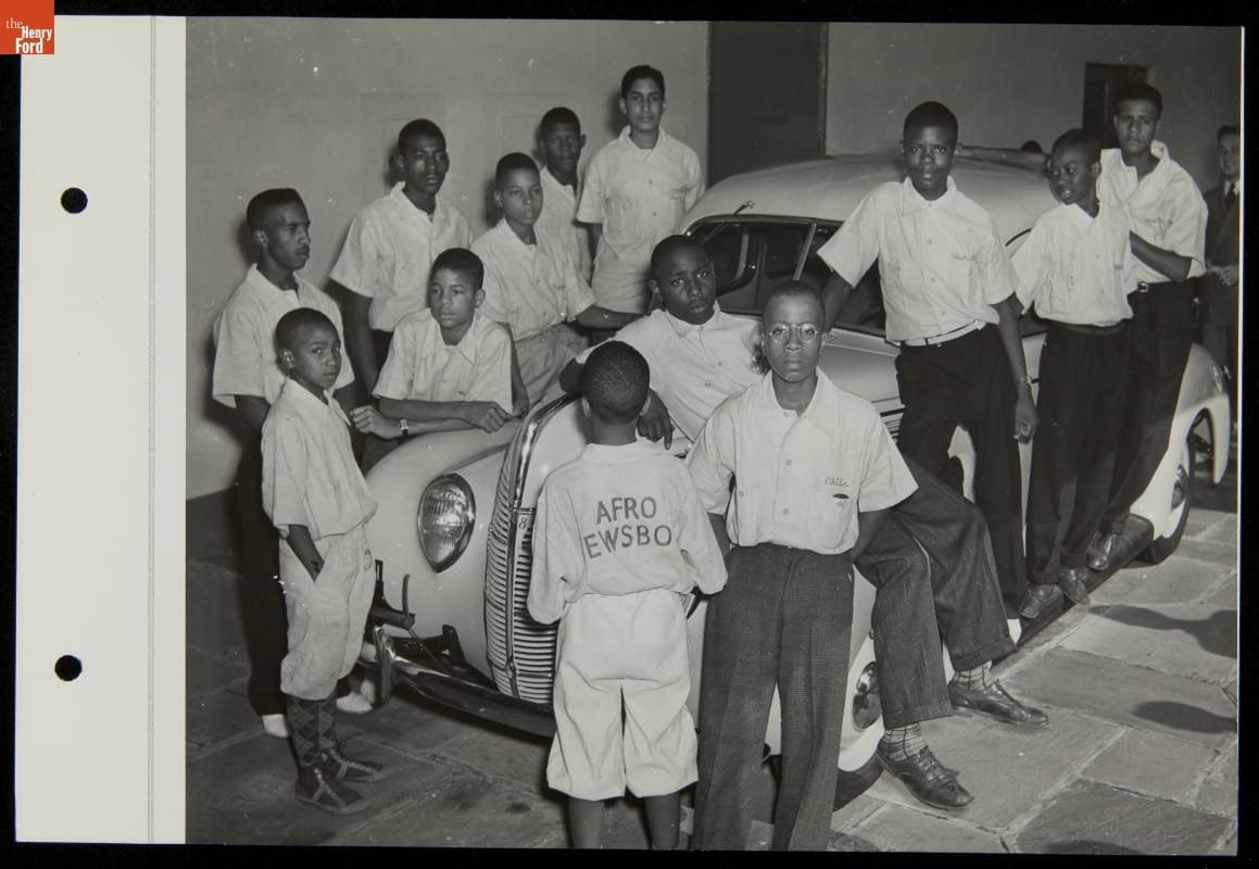 Ford Motor Company poured resources into the 1939-40 New York World's Fair, spending more than $5 million to construct and maintain its elaborate and well-attended exhibition space. Ford hosted many special guests during the two-year event--including this group of newsboys, who numbered among the reported 15 million fairgoers to visit the company's exposition.
