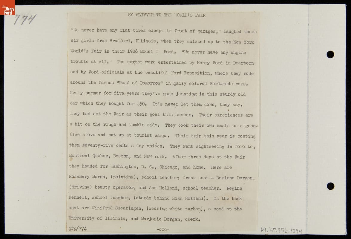 Young Women Travelers from Bradford, Illinois in Their 1926 Ford Model T, New York World's Fair, 1939