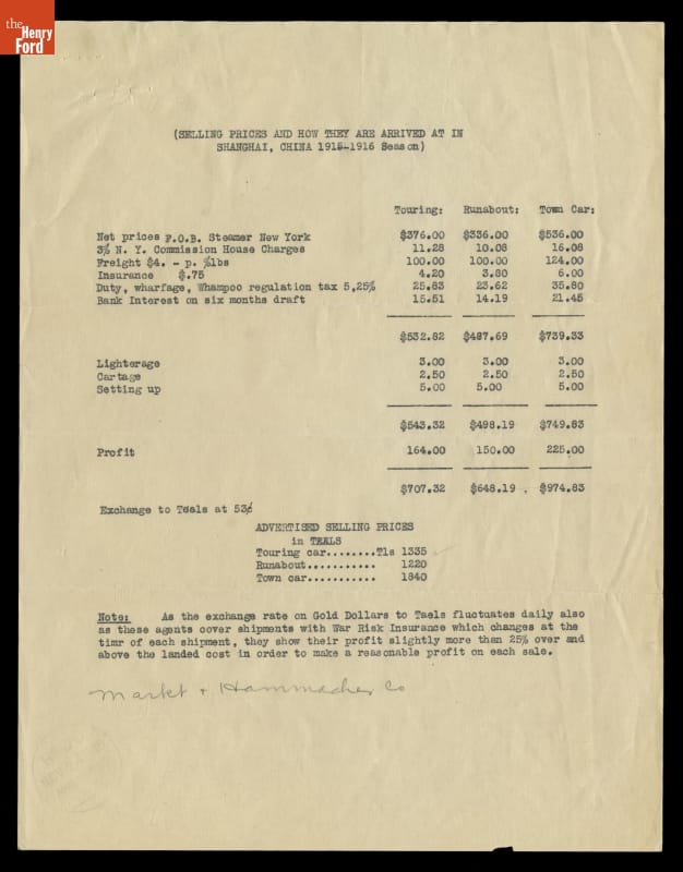 Selling Prices for Ford Model T Cars and How They Are Arrived at in Shanghai, China, 1915-1916 Season