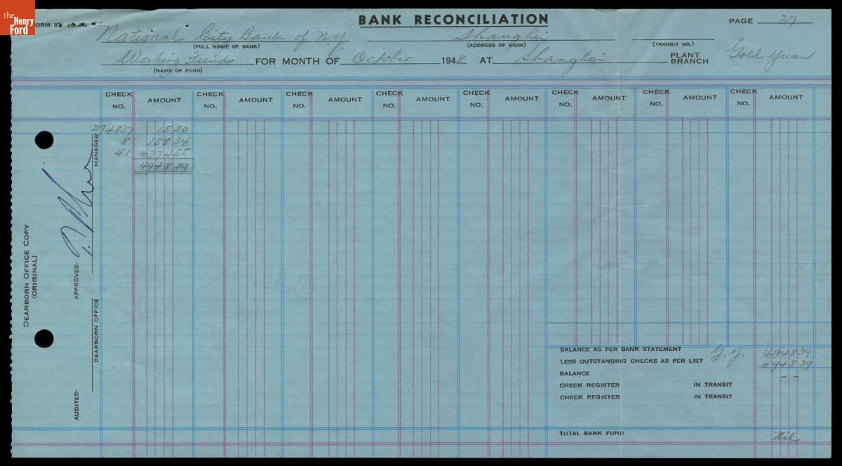 Letter from T. P. Lee with Bank Statement Closing the Ford Shanghai Branch, October 28, 1948