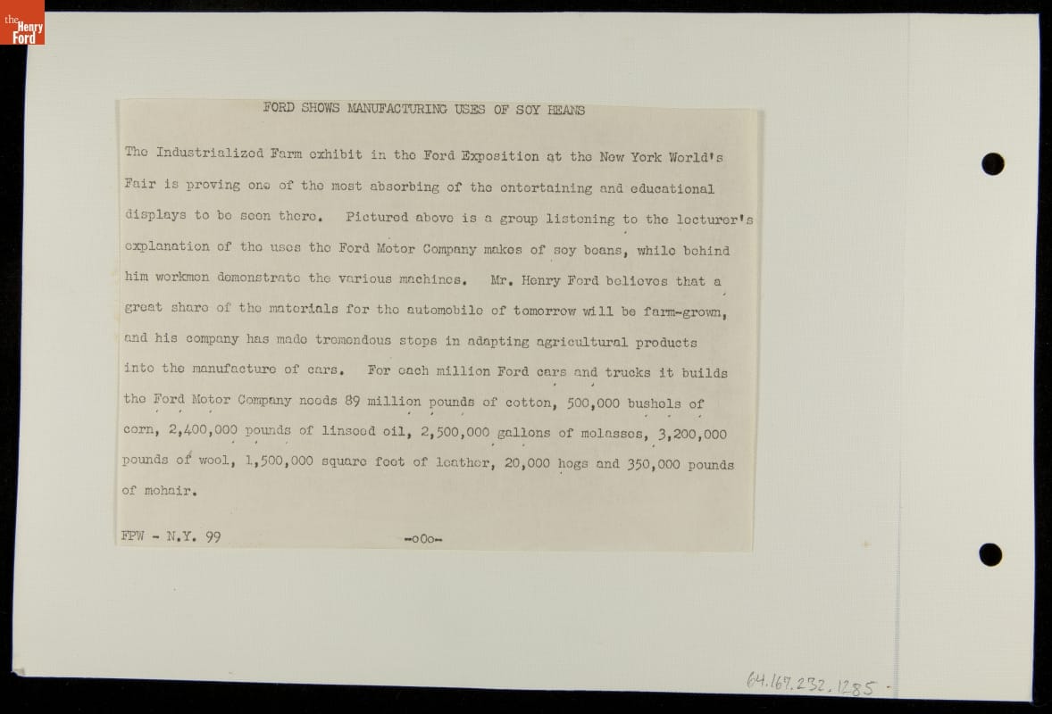 Ford Motor Company poured resources into the 1939-40 New York World's Fair, spending more than $5 million to construct and maintain its elaborate and well-attended exposition space. Ford's massive exhibition building attracted fairgoers with industrial demonstrations and informative displays in two main halls. At the "industrialized farm," visitors could learn about soybeans and watch presenters process them into plastics and fibers.