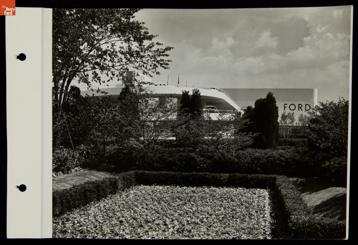 Ford Motor Company was a major participant in the 1939-40 New York World's Fair. In addition to educational demonstrations, exhibits, complimentary entertainment, and rides on the Road of Tomorrow experience, visitors to the Ford exposition found places to rest. Outdoors, on the grounds of the Ford building, fairgoers could relax among fountains and landscaped gardens.
