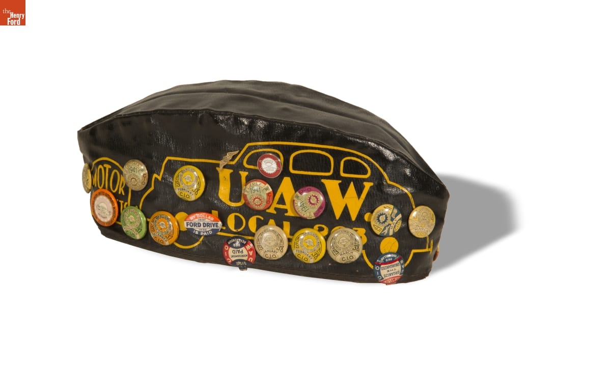 Daniel Corner proudly wore this cap to United Auto Workers labor union meetings, adding buttons to his cap every year between October 1937 and January 1942. During this time, he worked for Ford Motor Company and may have faced threats of violence from Ford security staff for his union activities. Ford officially unionized on June 20, 1941.