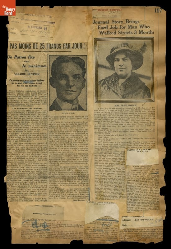 Henry Ford's office kept a file of newspaper articles that covered Ford Motor Company and other topics of interest to Mr. Ford. These clippings are from the days following Ford's announcement of the Five Dollar Day profit-sharing plan in January 1914. While Ford's primary goal was to reduce employee turnover, the raise generated great publicity around the world.