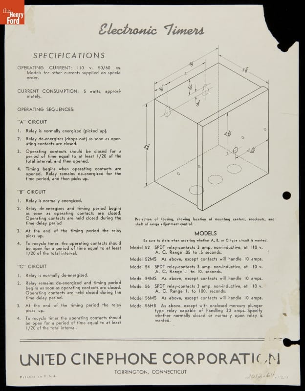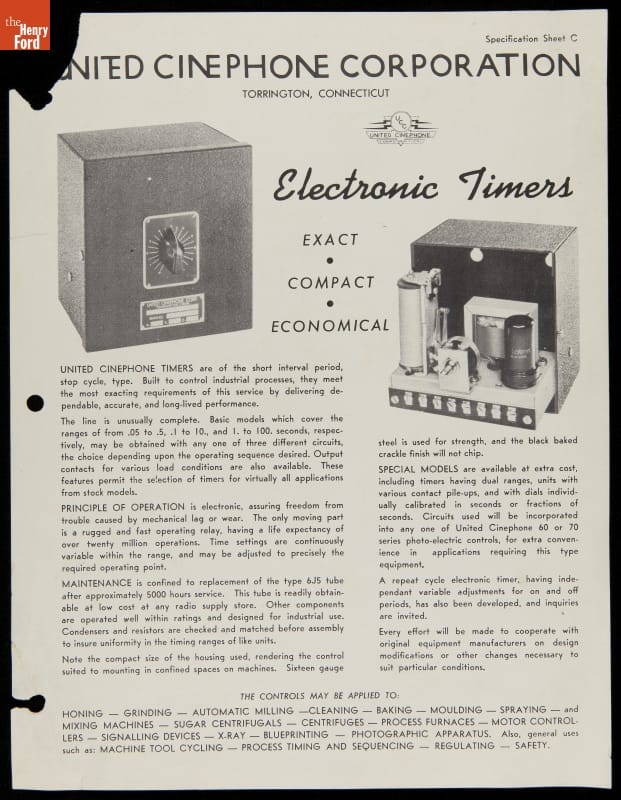 Electronic Timers, Specification Sheet C, circa 1940