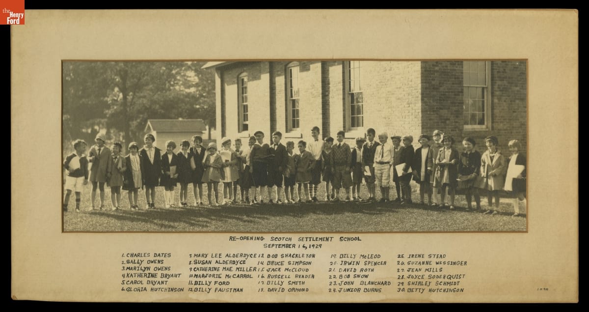 Scotch Settlement School was where Henry Ford spent his first two years of schooling from 1871 to 1873. In later life, with only a sixth grade education, Ford became known as an educational pioneer with his early Greenfield Village school system. This picture depicts the new class of 1930 at the start of the school year.