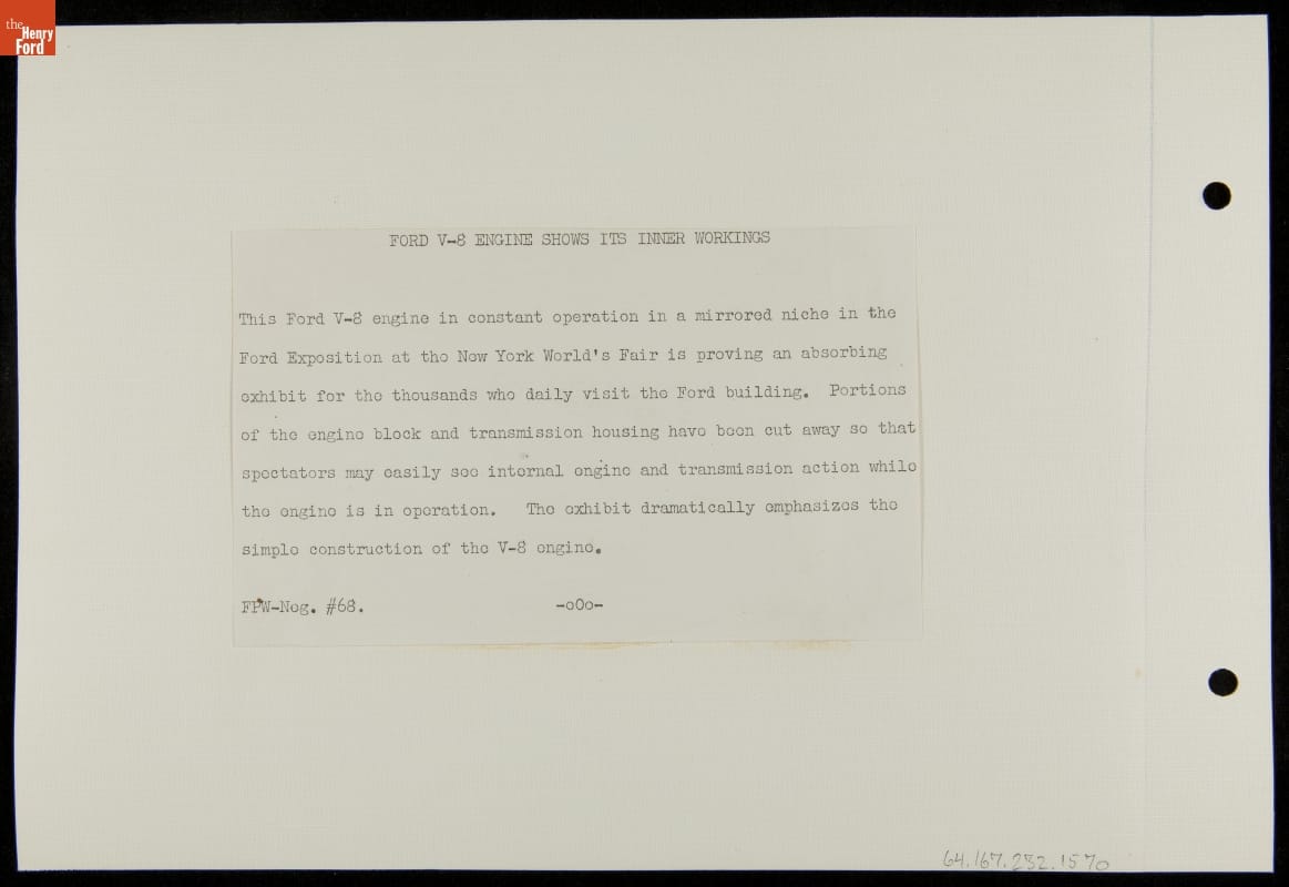 "Ford V-8 Engine Shows its Inner Workings," Ford Exposition, New York World's Fair, 1939