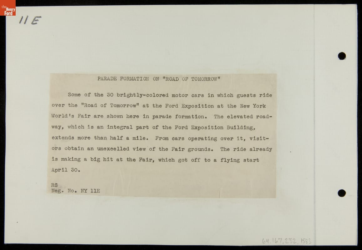 Ford Motor Company was a major participant in the 1939-40 New York World's Fair. In addition to viewing educational demonstrations and exhibits, Ford exposition visitors could ride in brand-new Ford automobiles along the Road of Tomorrow. Befitting the fair's "Building the World of Tomorrow" theme, this conceptual highway experience suggested modern techniques for safer, quieter, and more efficient roadways.
