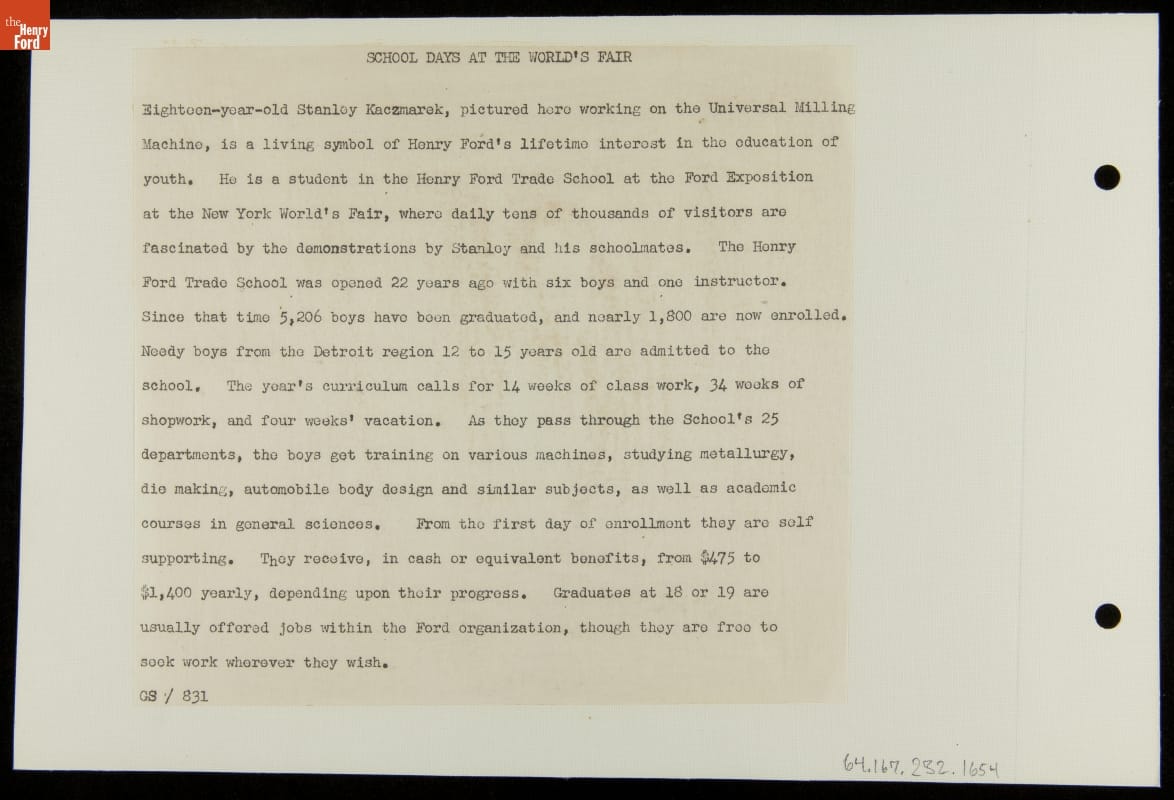 Henry Ford viewed national expositions as business opportunities and platforms for public education. During the 1939-40 New York World's Fair, Ford Motor Company spent more than $5 million to build and maintain an elaborate exposition space. Informative displays and manufacturing demonstrations inside Ford's massive fair building offered visitors an in-depth, entertaining, and educational look at industrial processes.