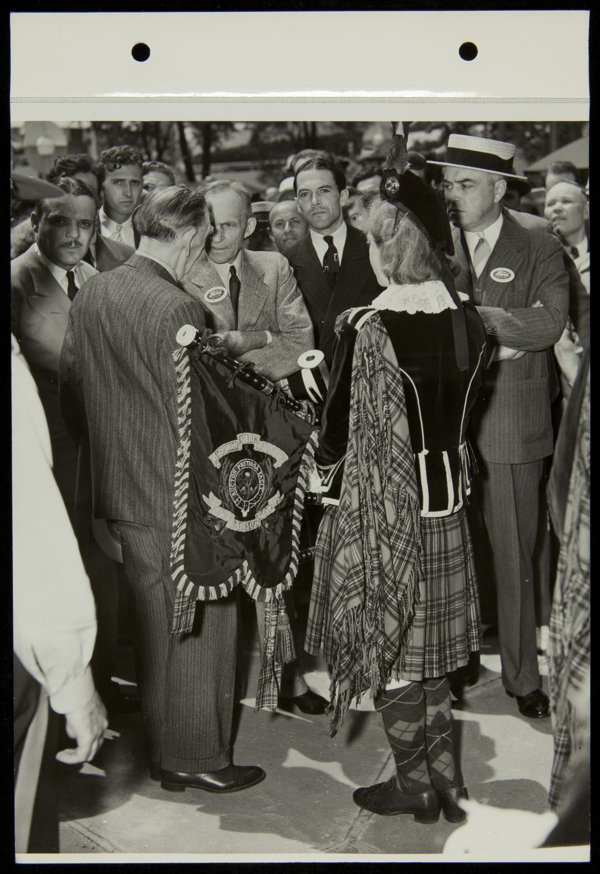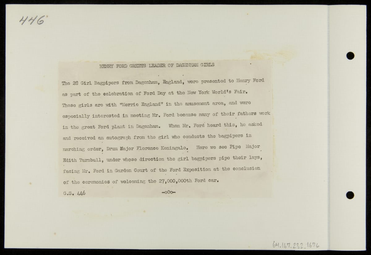 The 1939-40 New York World's Fair provided an opportunity for companies across the country to advertise to millions of people. Henry Ford was in attendance on June 16, 1939 for Ford Day, a celebration of Ford Motor Company, a major exhibitor at the exposition. Among the performers was London's renowned female bagpipe marching band, the Dagenham Girl Pipers.
