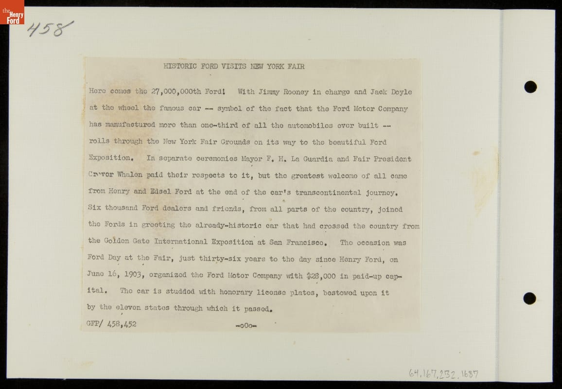 On February 15, 1939, the twenty-seven millionth Ford automobile rolled off a Richmond, California, assembly line. The green DeLuxe Tudor embarked on a promotional tour from San Francisco to New York City and back -- an 8,854-mile circuit. A visit to the 1939-40 New York World's Fair was a highlight of the famous sedan's transcontinental journey.