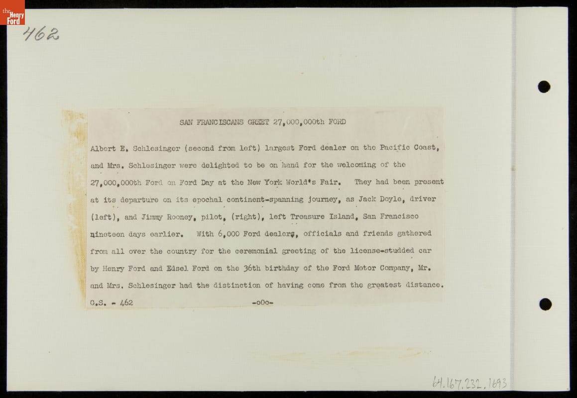 On February 15, 1939, the twenty-seven millionth Ford automobile rolled off a Richmond, California, assembly line. The green DeLuxe Tudor embarked on a promotional tour from San Francisco to New York City and back -- an 8,854-mile circuit. A visit to the 1939-40 New York World's Fair was a highlight of the famous sedan's transcontinental journey.