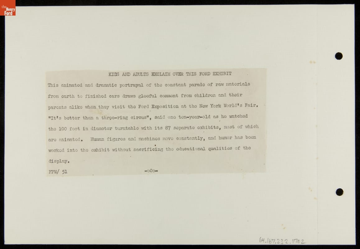 Ford Motor Company poured resources into the 1939-40 New York World's Fair, spending more than $5 million to construct and maintain its elaborate and well-attended exposition space. Ford's massive exhibition building attracted fairgoers with industrial demonstrations and informative displays. The huge, revolving "Ford Cycle of Production" - which explained how raw materials became Ford automobile parts - particularly impressed visitors.