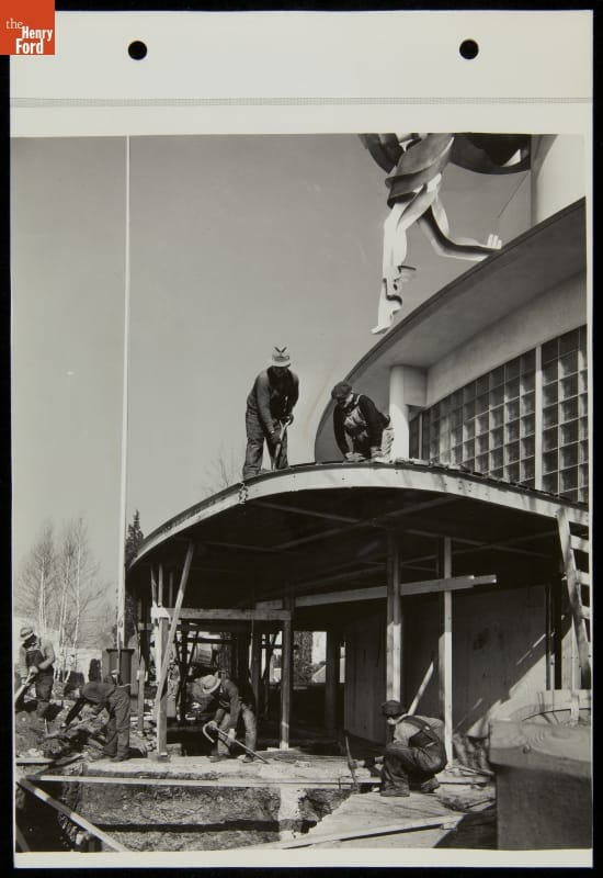 Ford Motor Company vigorously publicized its exhibition at the 1939-40 New York World's Fair. A dedicated Press Department photographed fair activities and regularly distributed the images to thousands of national publications. This example publicized wintertime construction on the Ford exhibit building. Workers were preparing for the 1940 fair, when Ford would unveil a new wing featuring a 420-seat theater.