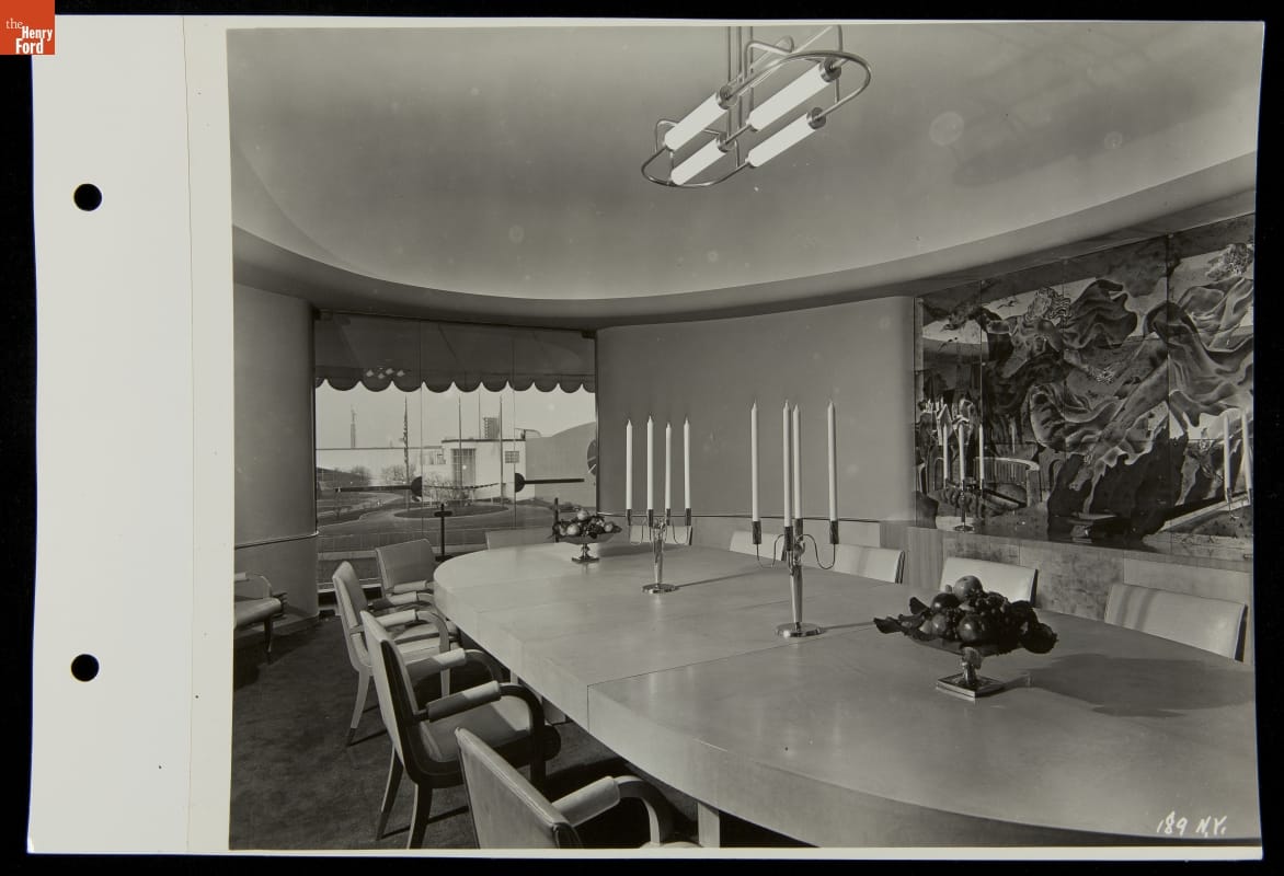 Ford Motor Company, a major participant in the 1939-40 New York World's Fair, hired industrial designer Walter Dorwin Teague to create its exhibition building. Inside, furnishings and decor reflected Teague's modern, eye-catching design. Clean curves, sharp lines, modern materials, and industrial imagery in Ford's executive and dealers' lounges symbolized the company's technological progress.