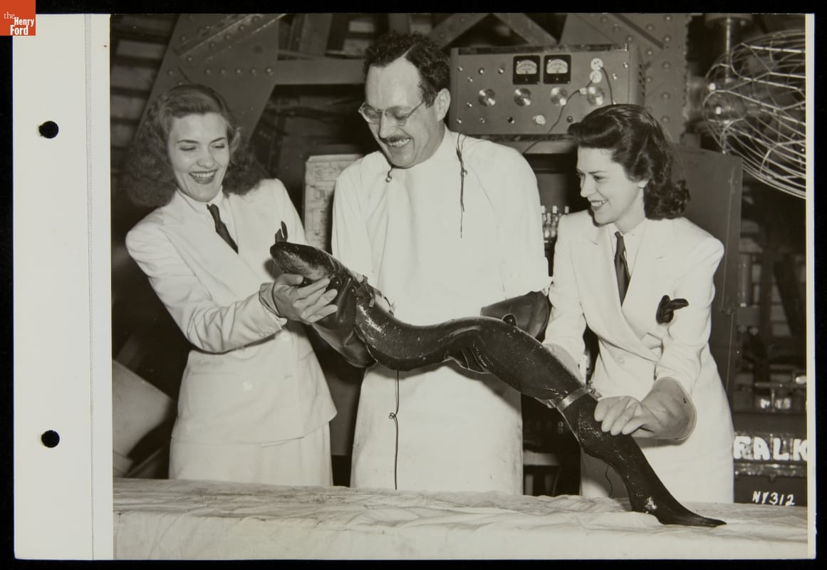 Electra, the electric eel, demonstrated her shocking talents at the 1939-40 New York's World's Fairs. This photo shows her being hooked up to restart the "Cycle of Production" exhibition at the Ford Pavilion. The exhibition had been shut down temporarily to test the eel's ability. Electra did not disappoint -- with a 500-volt jolt the display came back to life.
