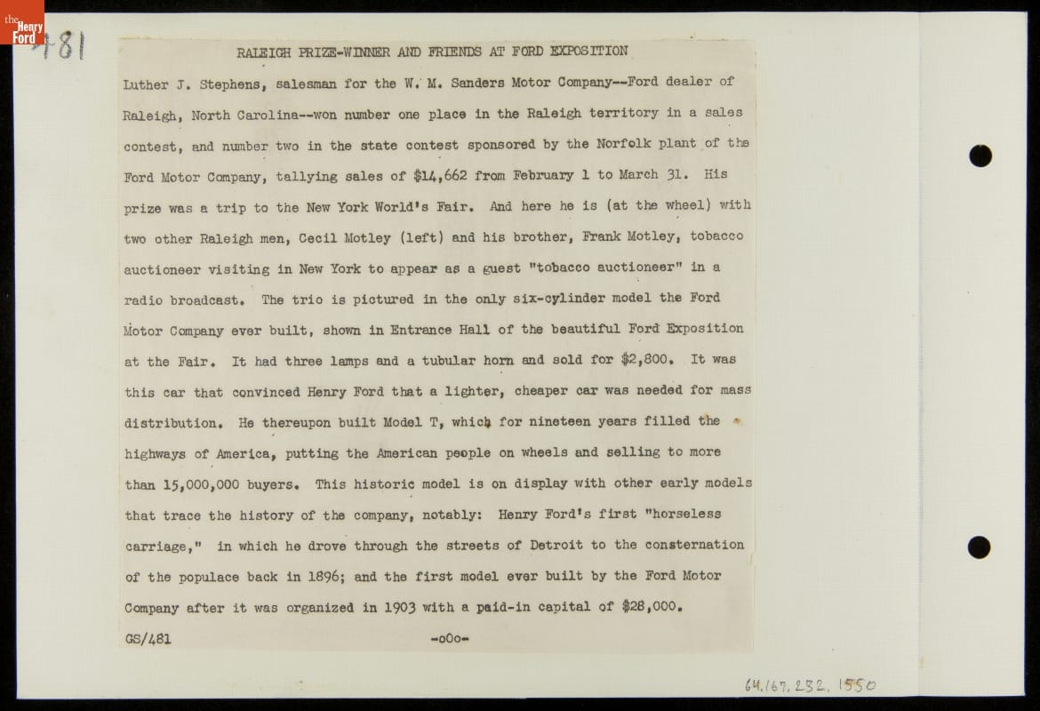 Ford Motor Company sponsored various contests throughout the U.S. to send people to the New York World's Fair. Luther Stephens won his trip for being the top Ford salesman in Raleigh, North Carolina, and second best in the state for February and March 1939. While at the fair, Stephens visited the displays at the Ford Exposition building.