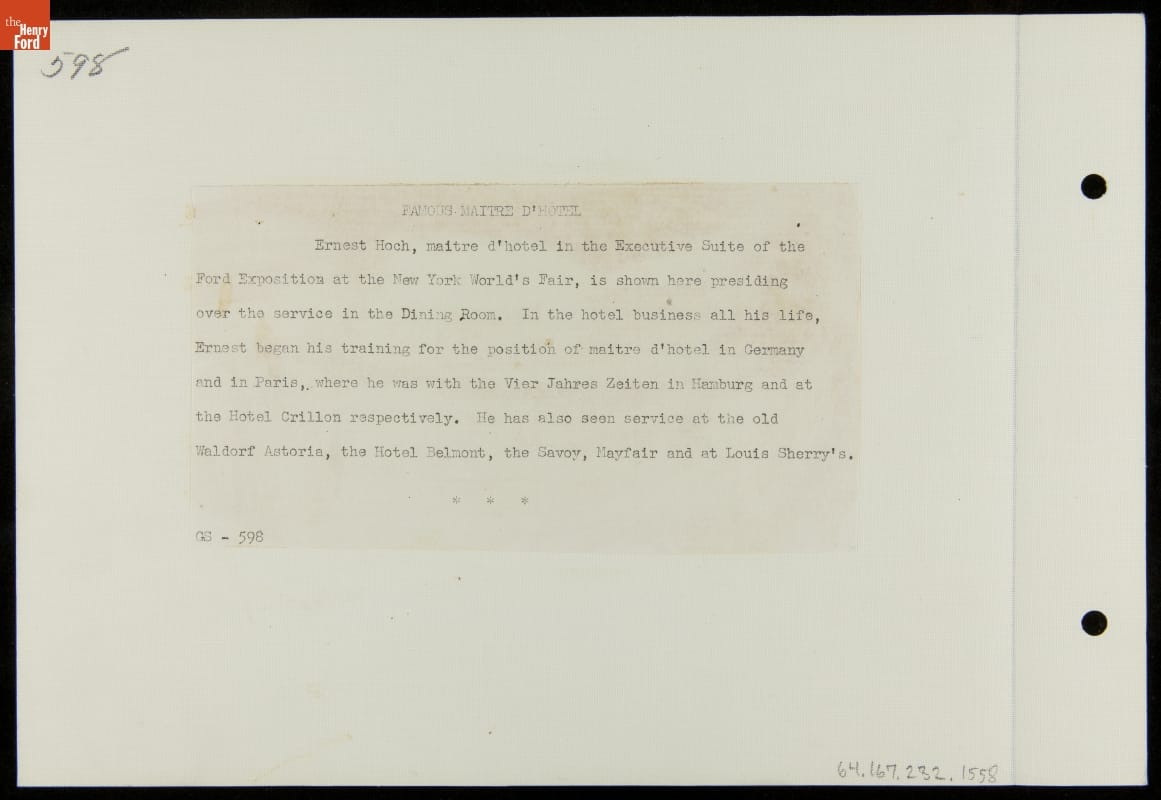 Maitre d'Hotel Ernest, Ford Exposition, New York World's Fair, 1939