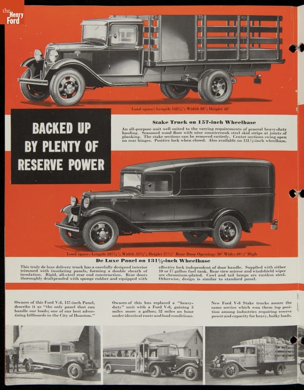 Ford Motor Company's 1934 trucks were only slightly changed in appearance from the previous model year, though the blue oval logo was added to the side of the hood. The stake body version was particularly versatile. The racks were removable to ease loading or accommodate oversized cargo. Ford's trucks were powered by the company's flathead V-8 engine.