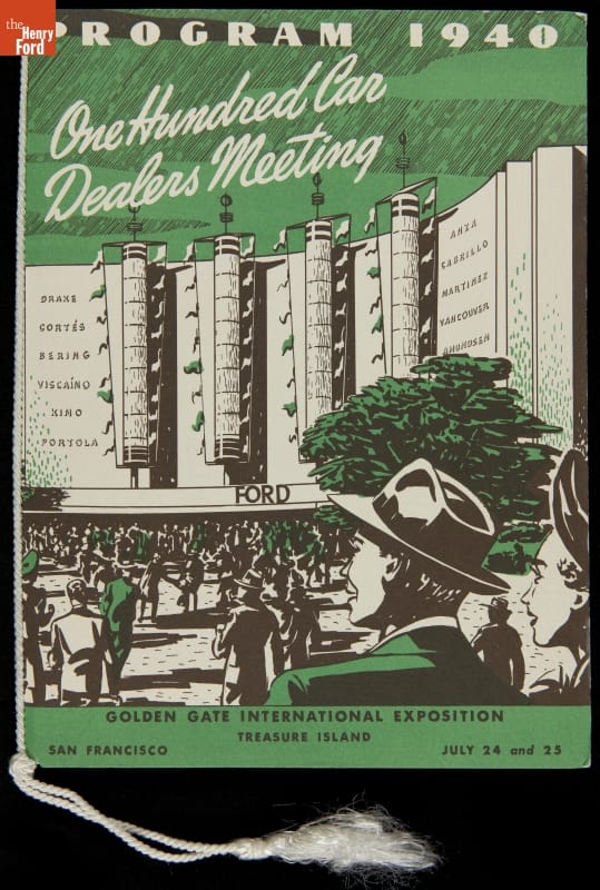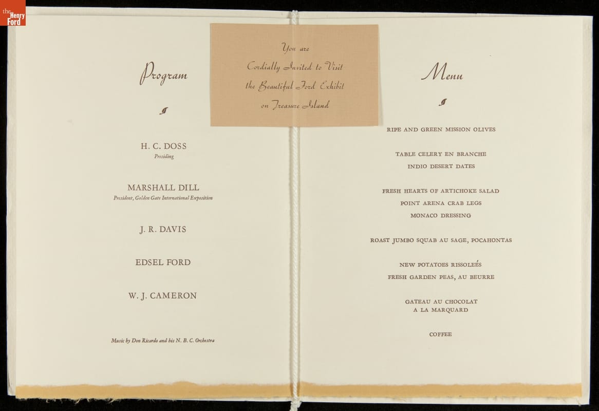 The 1939 Golden Gate International Exposition reflected American aspirations at the end of the Great Depression. Held on Treasure Island -- a manmade island in San Francisco Bay -- the fair celebrated the completion of the San Francisco-Oakland Bay and Golden Gate bridges. This program contains the menu for a Ford dealers' meeting at the "beautiful Ford exhibit" on Treasure Island.