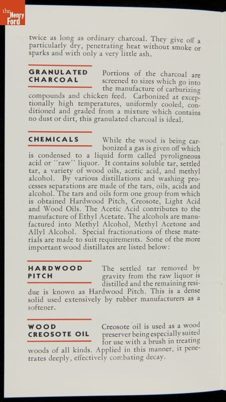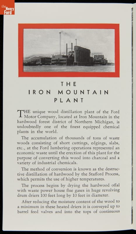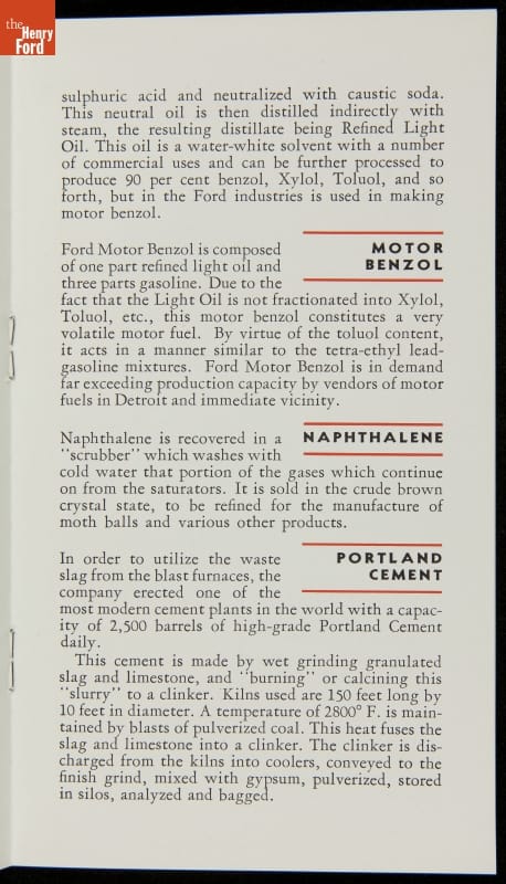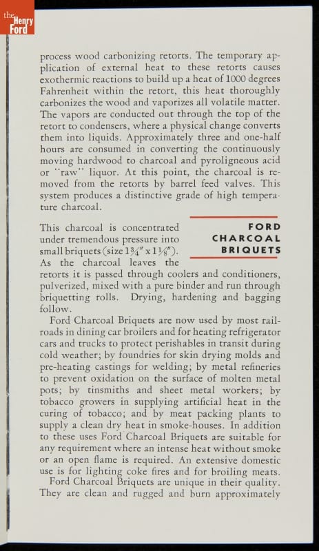 Henry Ford was careful about reducing and reusing waste products from his factories. Wasted materials meant wasted money, which led to higher prices for the customer. Illuminating gas was taken from coke ovens. Portland cement was made from blast furnace slag. Most famously, wood scraps from Ford's Kingsford, Michigan, sawmills were converted into charcoal briquettes.