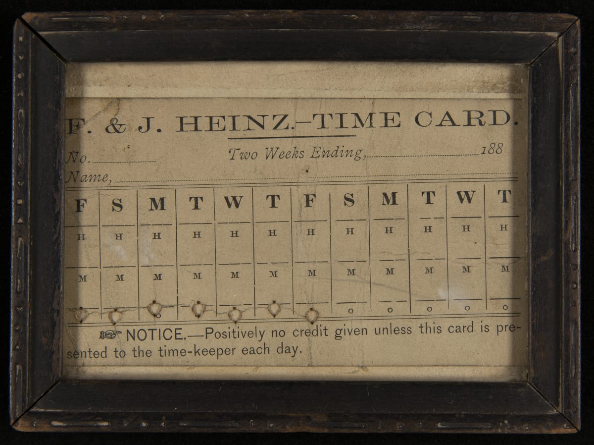 Framed Employee Time Card, F. & J. Heinz Company, circa 1885