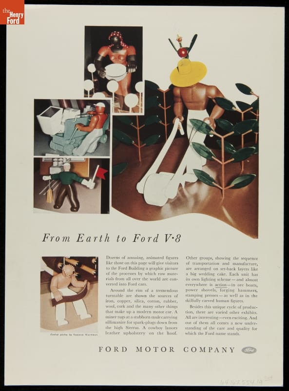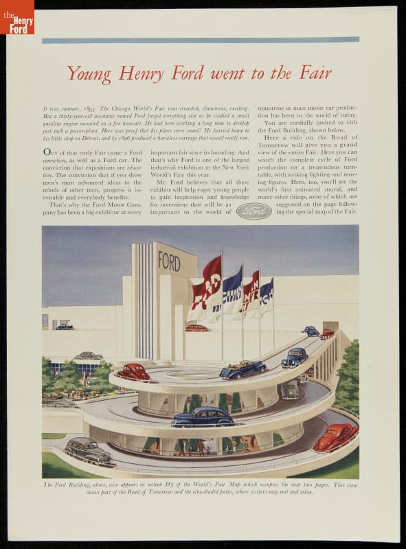 In 1893, three years before constructing his first automobile, Henry Ford was inspired by an internal combustion engine at Chicago's World's Columbian Exposition. Within a few decades, Ford Motor Company would become a leading exhibitor in expositions throughout the country. This magazine ad highlights the company's historic relationship with world's fairs and advertises Ford's 1939-40 New York World's Fair building.