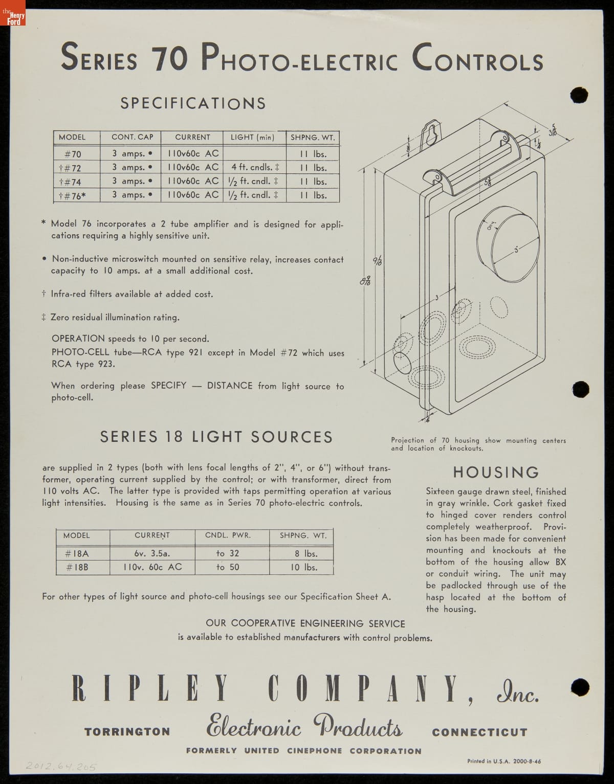 Ripley Company, Inc. Brochure, "Series 70 Photo-Electric Controls," 1946