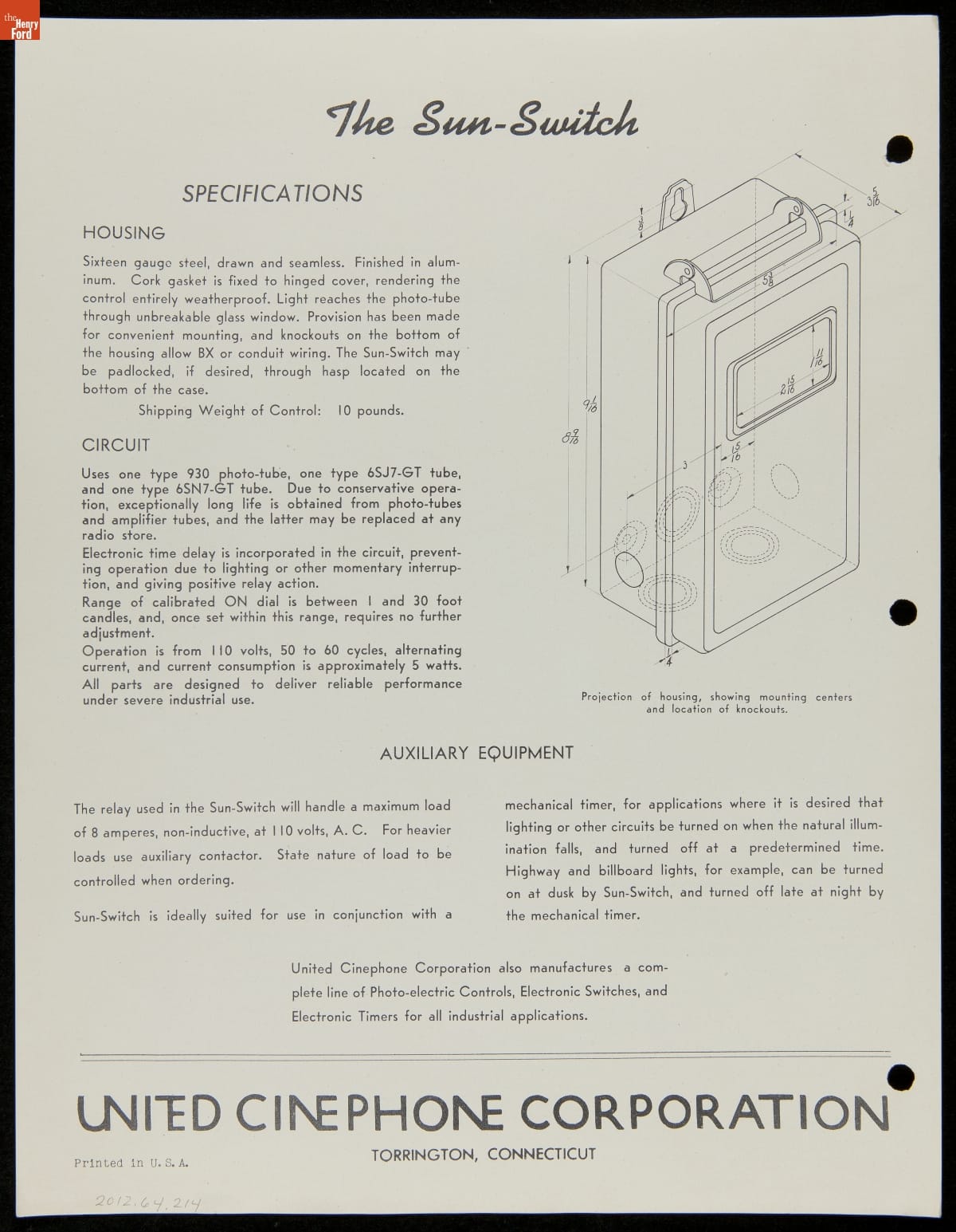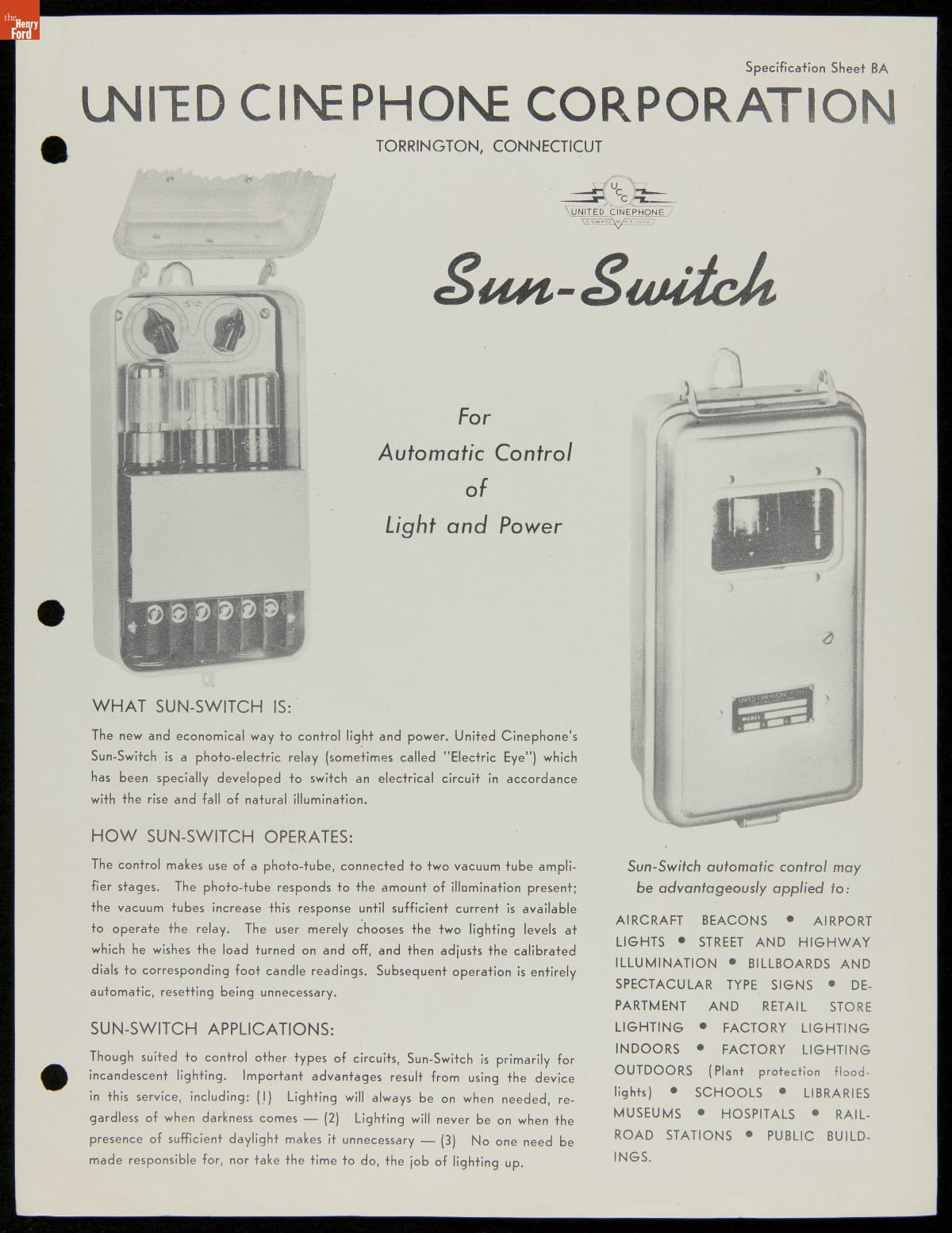 Specification Sheet BA / UNITED CINEPHONE CORPORATION / TORRINGTON, CONNECTICUT / [. . .] / Sun-Switch [. . .]