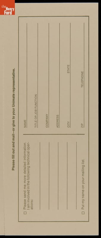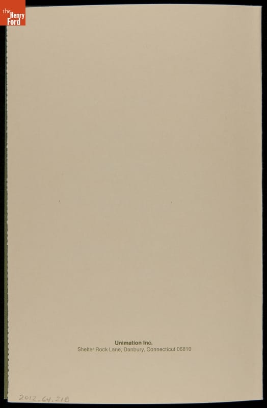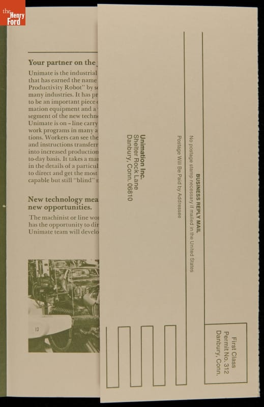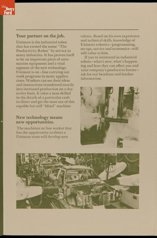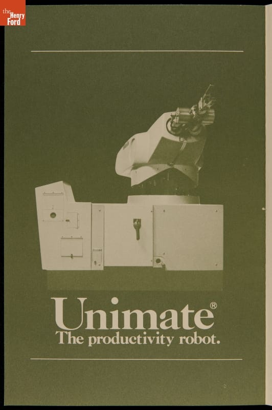 George Devol revolutionized manufacturing with his invention of the Unimate -- the world's first industrial robot. These rugged programmable units were designed to perform repetitive, arduous and hazardous tasks. The first Unimate was installed in a General Motors plant in 1961. This brochure, part of a larger archival collection documenting Devol's work, illustrates the functions and uses of his innovative idea.