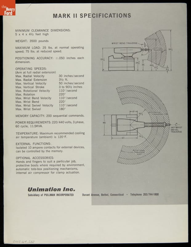 George Devol revolutionized manufacturing with his invention of the Unimate -- the world's first industrial robot. These rugged programmable units were designed to perform repetitive, arduous and hazardous tasks. The first Unimate was installed in a General Motors plant in 1961. This brochure, part of a larger archival collection documenting Devol's work, illustrates the functions and uses of his innovative idea.