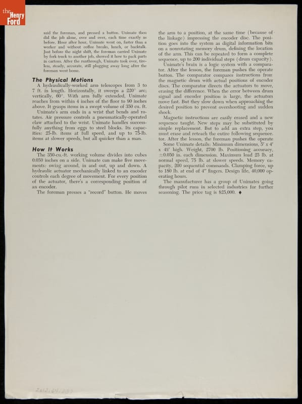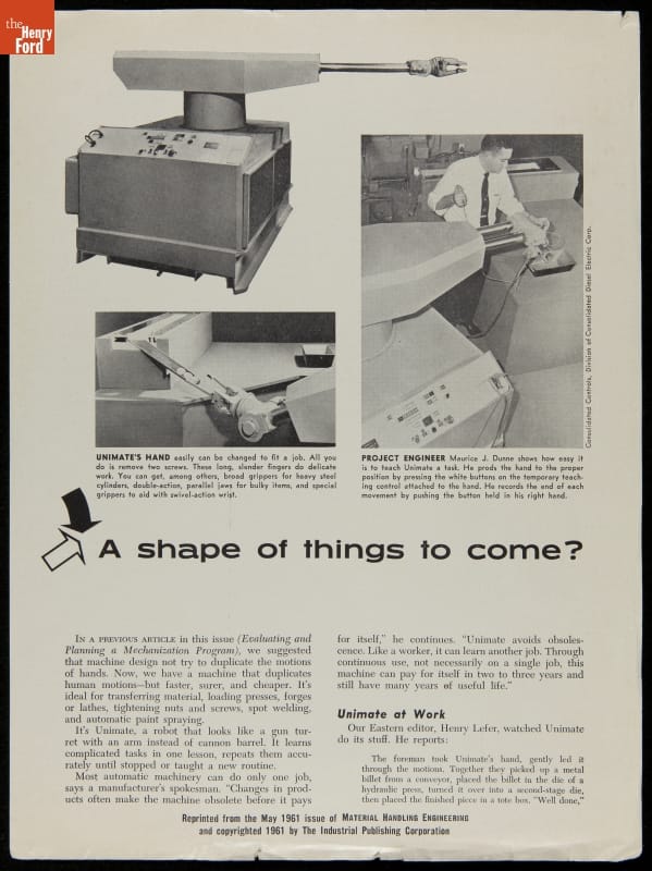 George Devol revolutionized manufacturing with his invention of the Unimate -- the world's first industrial robot. These rugged programmable units were designed to perform repetitive, arduous and hazardous tasks. The first Unimate was installed in a General Motors plant in 1961. This brochure, part of a larger archival collection documenting Devol's work, illustrates the functions and uses of his innovative idea.