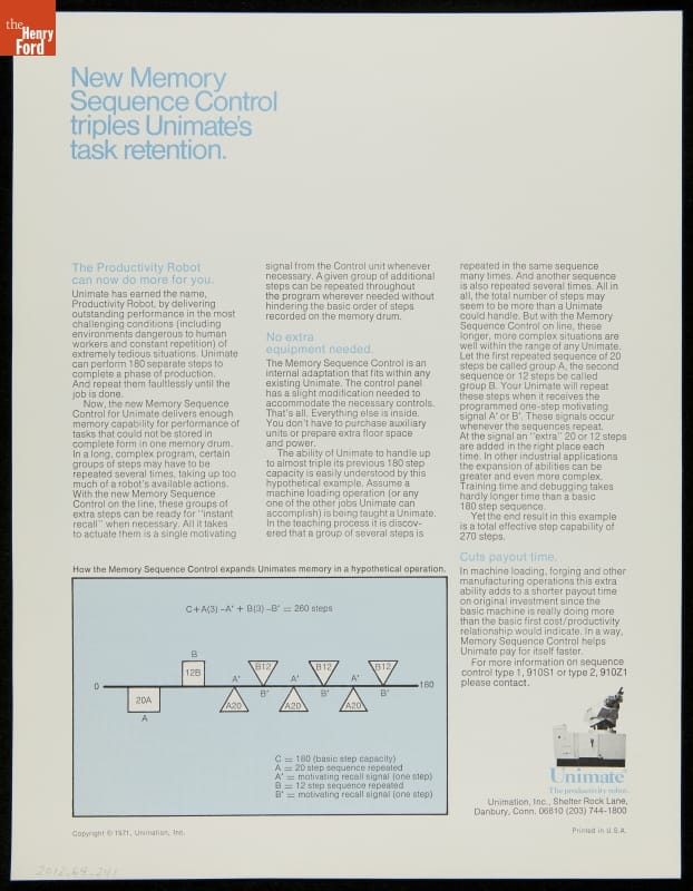 George Devol revolutionized manufacturing with his invention of the Unimate -- the world's first industrial robot. These rugged programmable units were designed to perform repetitive, arduous and hazardous tasks. The first Unimate was installed in a General Motors plant in 1961. This brochure, part of a larger archival collection documenting Devol's work, illustrates the functions and uses of his innovative idea.