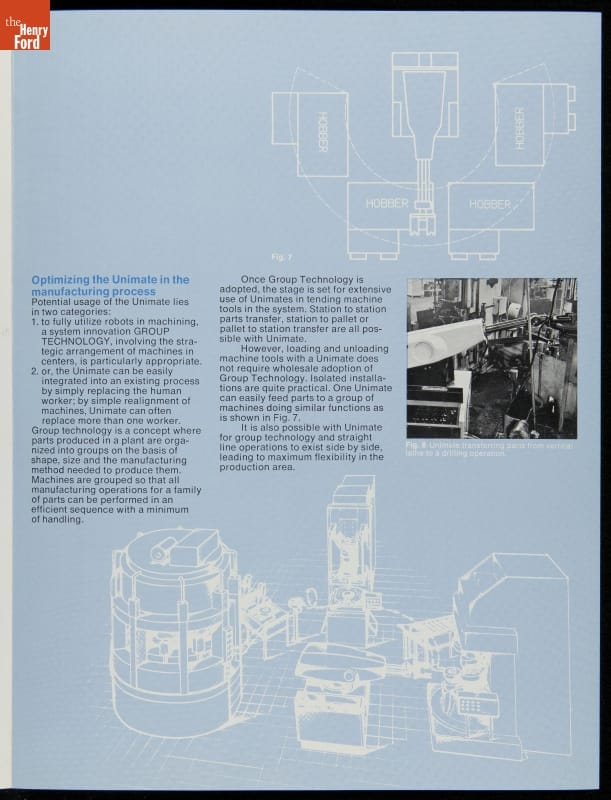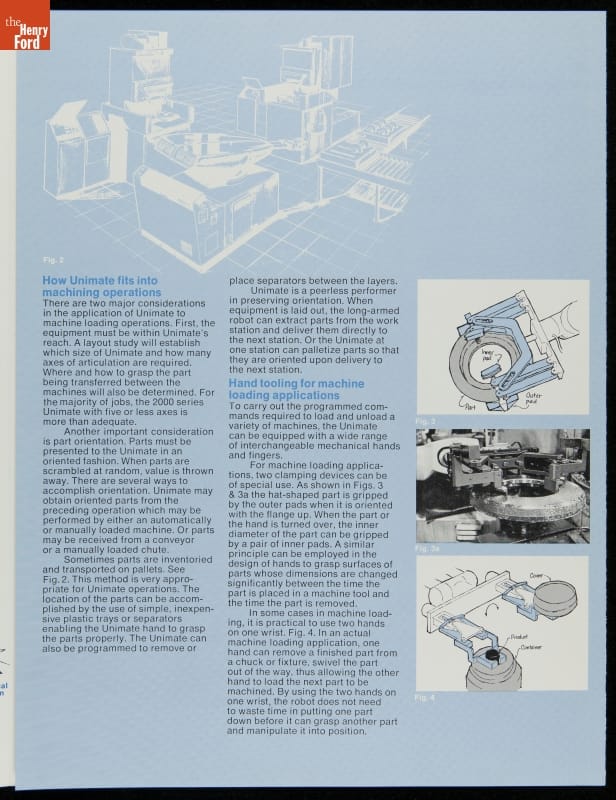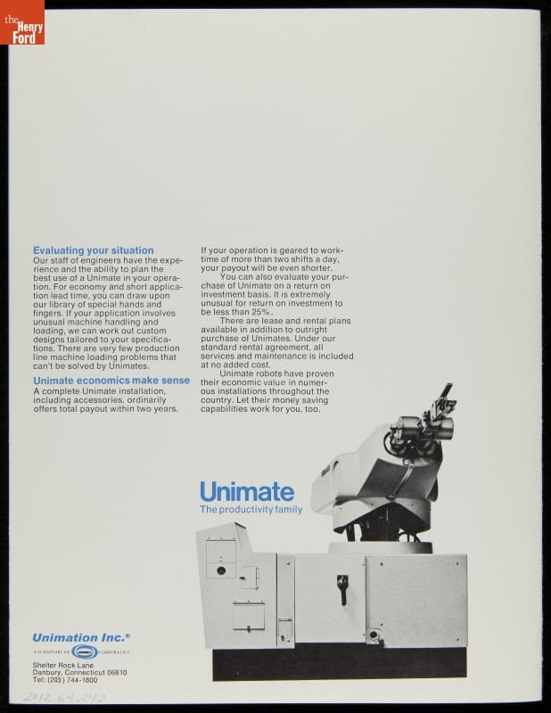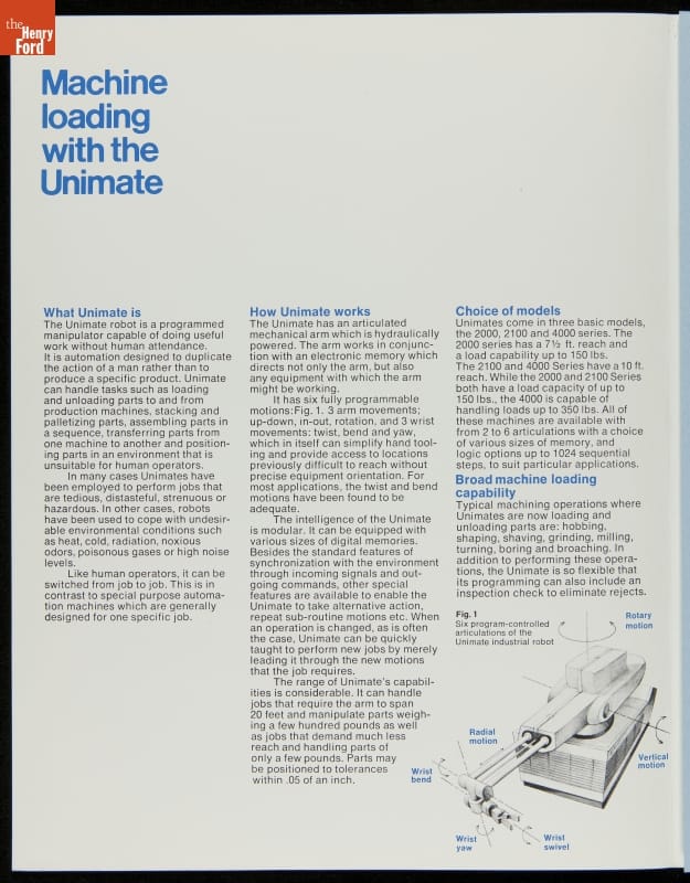 George Devol revolutionized manufacturing with his invention of the Unimate -- the world's first industrial robot. These rugged programmable units were designed to perform repetitive, arduous and hazardous tasks. The first Unimate was installed in a General Motors plant in 1961. This brochure, part of a larger archival collection documenting Devol's work, illustrates the functions and uses of his innovative idea.