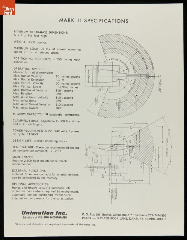 George Devol revolutionized manufacturing with his invention of the Unimate -- the world's first industrial robot. These rugged programmable units were designed to perform repetitive, arduous and hazardous tasks. The first Unimate was installed in a General Motors plant in 1961. This brochure, part of a larger archival collection documenting Devol's work, illustrates the functions and uses of his innovative idea.