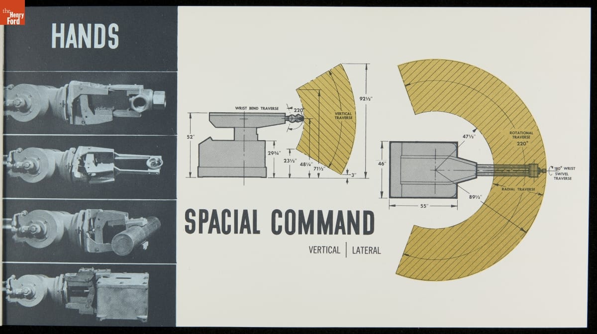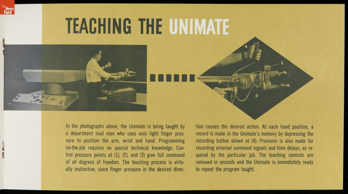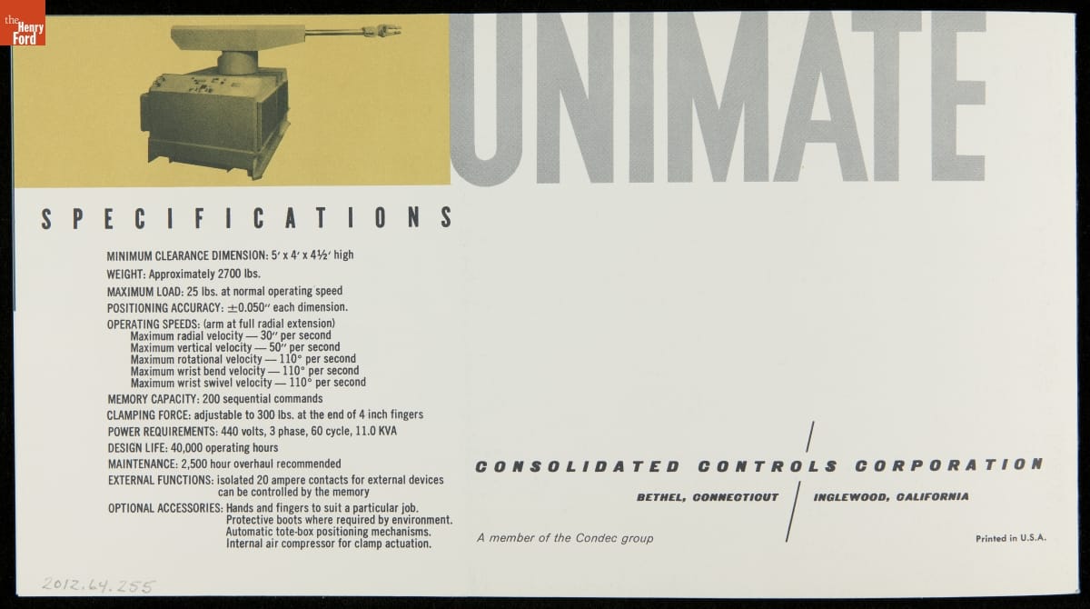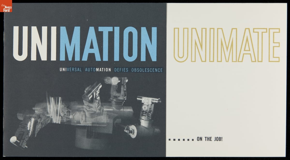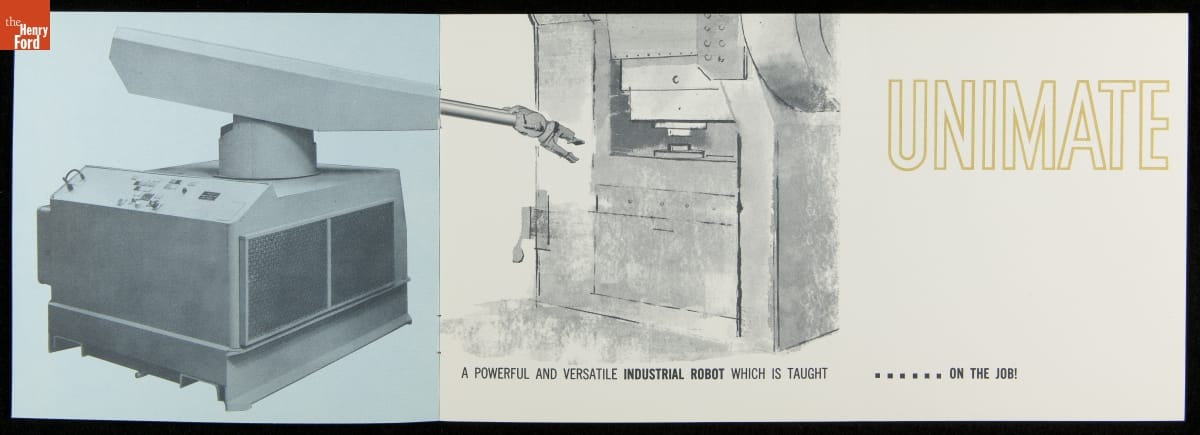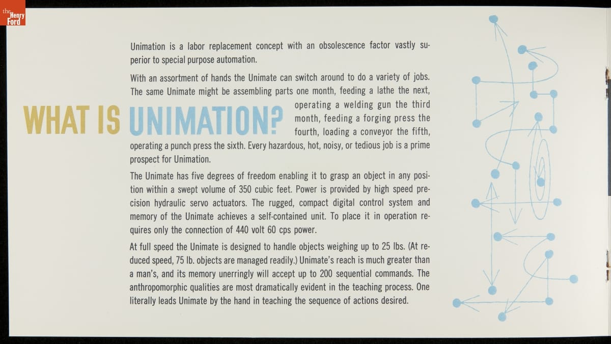 George Devol revolutionized manufacturing with his invention of the Unimate -- the world's first industrial robot. These rugged programmable units were designed to perform repetitive, arduous and hazardous tasks. The first Unimate was installed in a General Motors plant in 1961. This brochure, part of a larger archival collection documenting Devol's work, illustrates the functions and uses of his innovative idea.
