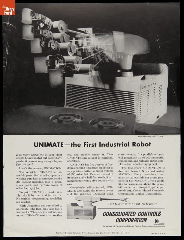 George Devol revolutionized manufacturing with his invention of the Unimate -- the world's first industrial robot. These rugged programmable units were designed to perform repetitive, arduous and hazardous tasks. The first Unimate was installed in a General Motors plant in 1961. This brochure, part of a larger archival collection documenting Devol's work, illustrates the functions and uses of his innovative idea.