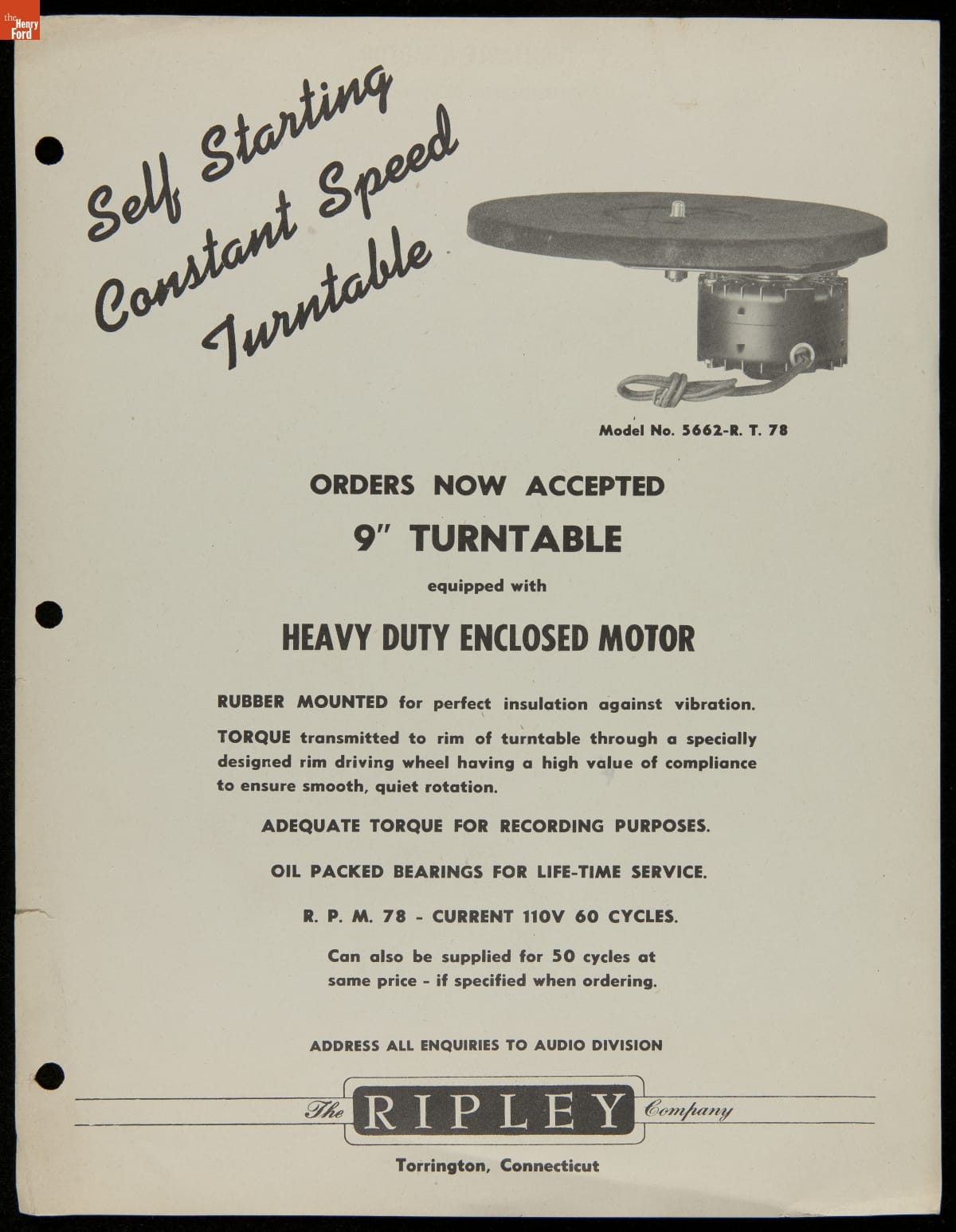 Ripley Company Brochure, "Self Starting Constant Speed Turntable," 1946