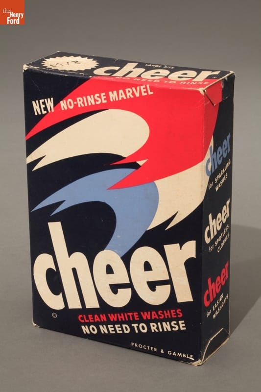 Procter & Gamble introduced Cheer detergent in 1950, following up on its highly successful product Tide. Cheer was recognized for its distinctive blue granules that claimed to make clothes whiter by performing the extra cleaning process that bluing had done. The design on this box is cheerful in itself--with three billowy shapes reminiscent of sheets blowing in the breeze.