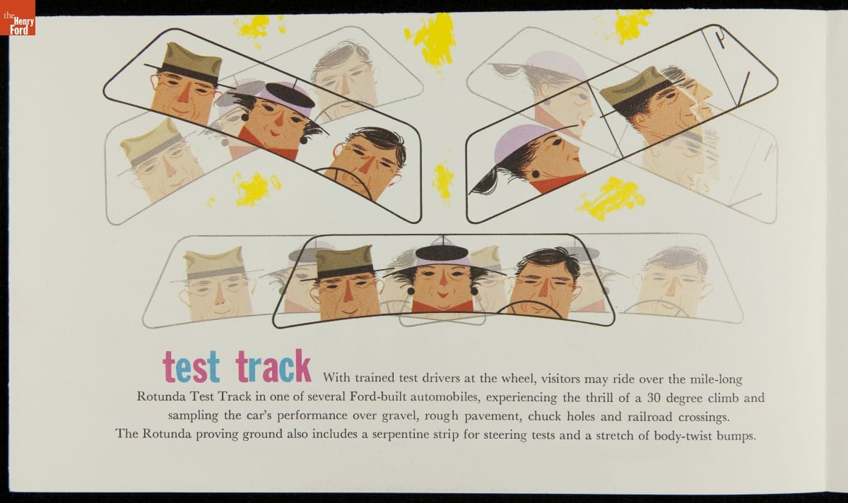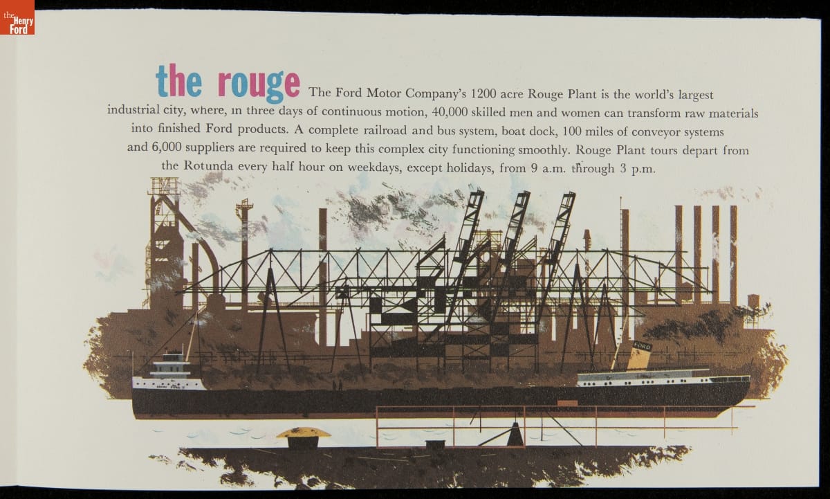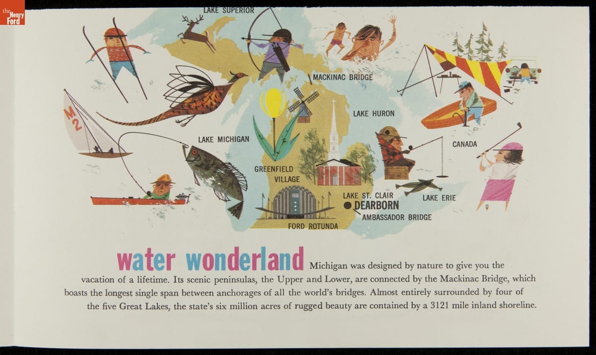 Ford Motor Company brought its central Rotunda building from the 1934 Century of Progress Exposition back to Dearborn and, from 1936 to 1962, recreated the excitement of a World's Fair exposition on its home turf. This brochure enticed travelers to visit the Ford Rotunda, Rouge Plant, Ford Research and Engineering Center, Greenfield Village, and even Michigan's "water wonderland."