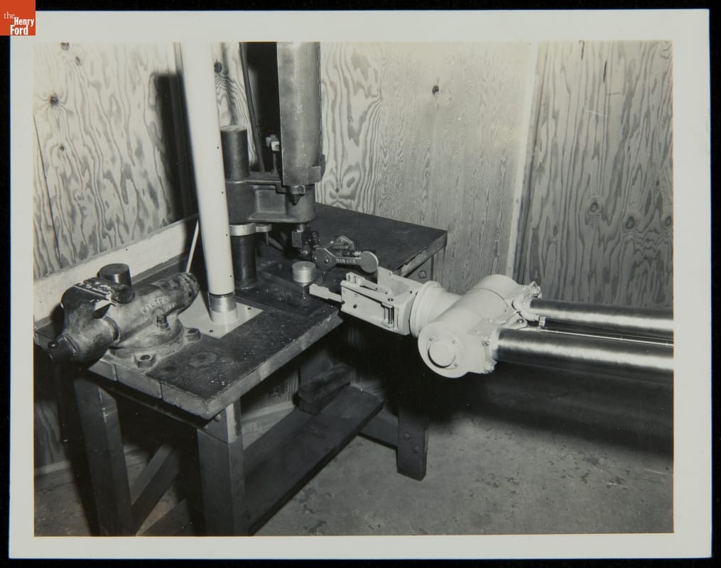 George Devol revolutionized manufacturing with his invention of the Unimate -- the world's first industrial robot. These rugged programmable units were designed to perform repetitive, arduous and hazardous tasks. The first Unimate was installed in a General Motors plant in 1961. This photograph, part of a larger archival collection documenting Devol's work, illustrates the functions and uses of his innovative idea.