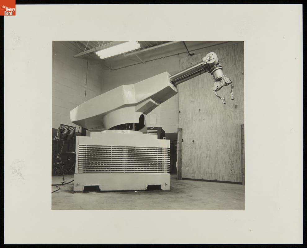 George Devol revolutionized manufacturing with his invention of the Unimate -- the world's first industrial robot. These rugged programmable units were designed to perform repetitive, arduous and hazardous tasks. The first Unimate was installed in a General Motors plant in 1961. This photograph, part of a larger archival collection documenting Devol's work, illustrates the functions and uses of his innovative idea.