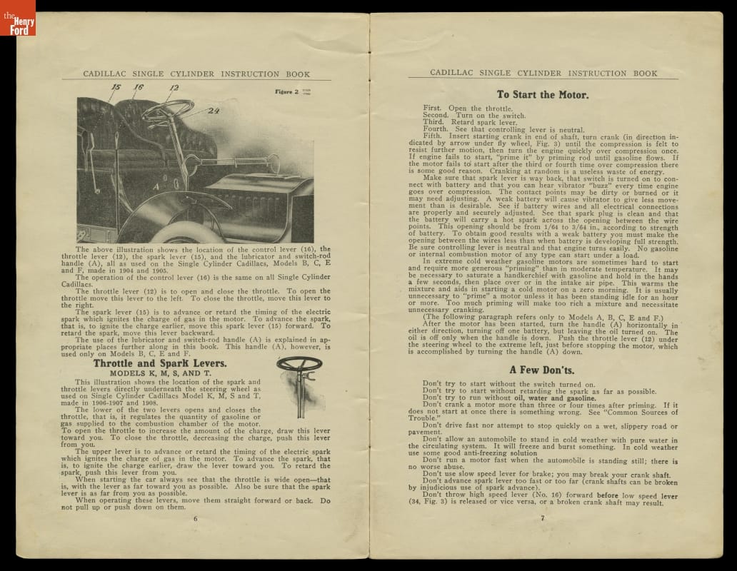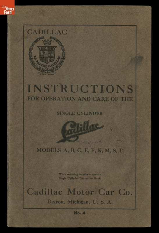 Owner's Manual, "Instructions for Use and Care of the Single Cylinder Cadillac Models A, B, C, E, F, K, M, S, T," 1903-1908