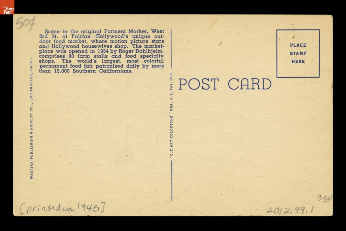 The Original Farmer's Market began in 1934 when a dozen farmers sold produce out of their trucks to local residents. Permanent stalls soon replaced the trucks and by the late 1940s -- this postcard's date -- the Farmer's Market had become a favorite place for Hollywood stars, out-of-town tourists, and local families to meet, eat, and shop.