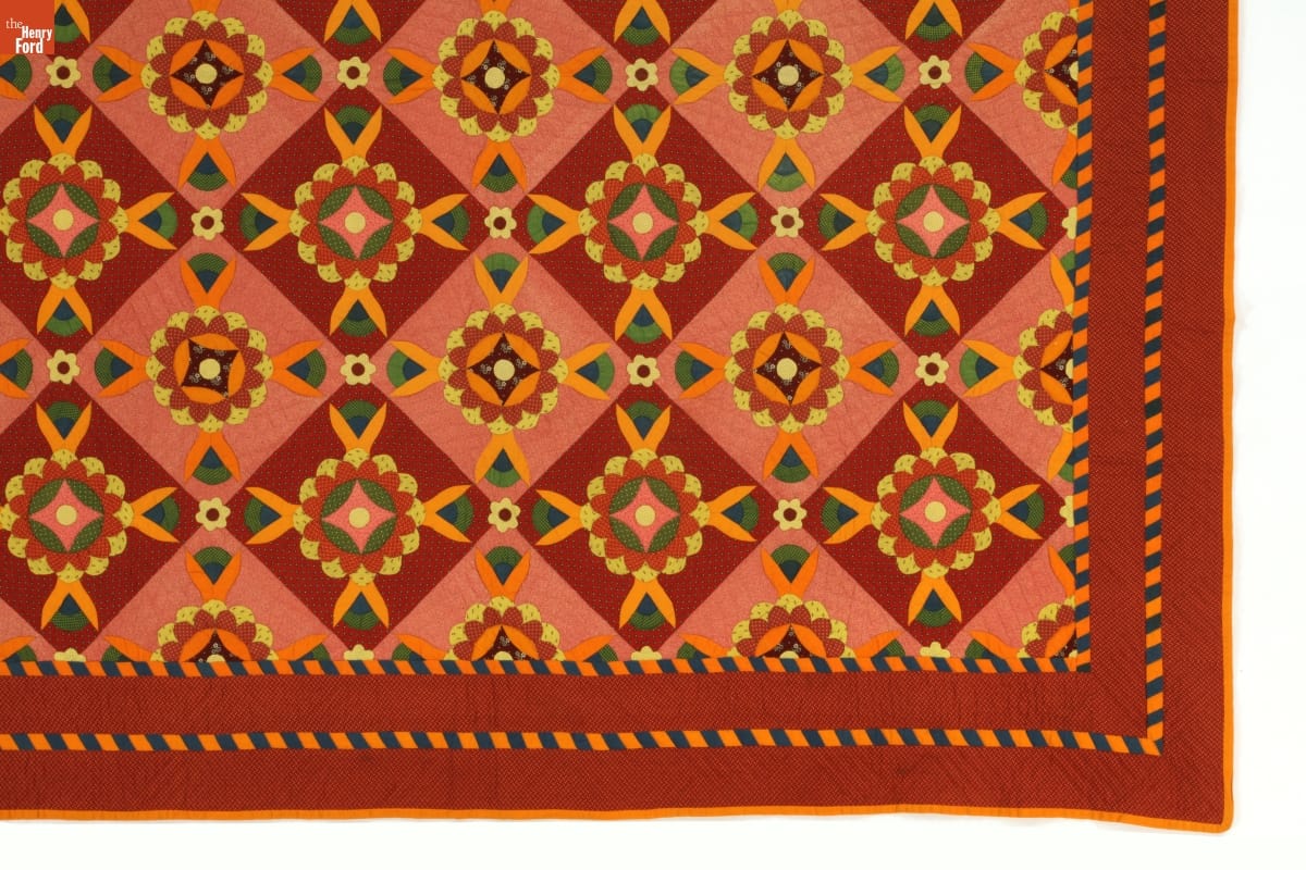 Quilting Pattern: Center of each block: a four-pointed design surrounding a circle within a circle quiltedon the seam line; rest of the top quilted in various grid crosshatch, single parallel lines, and outline designs
