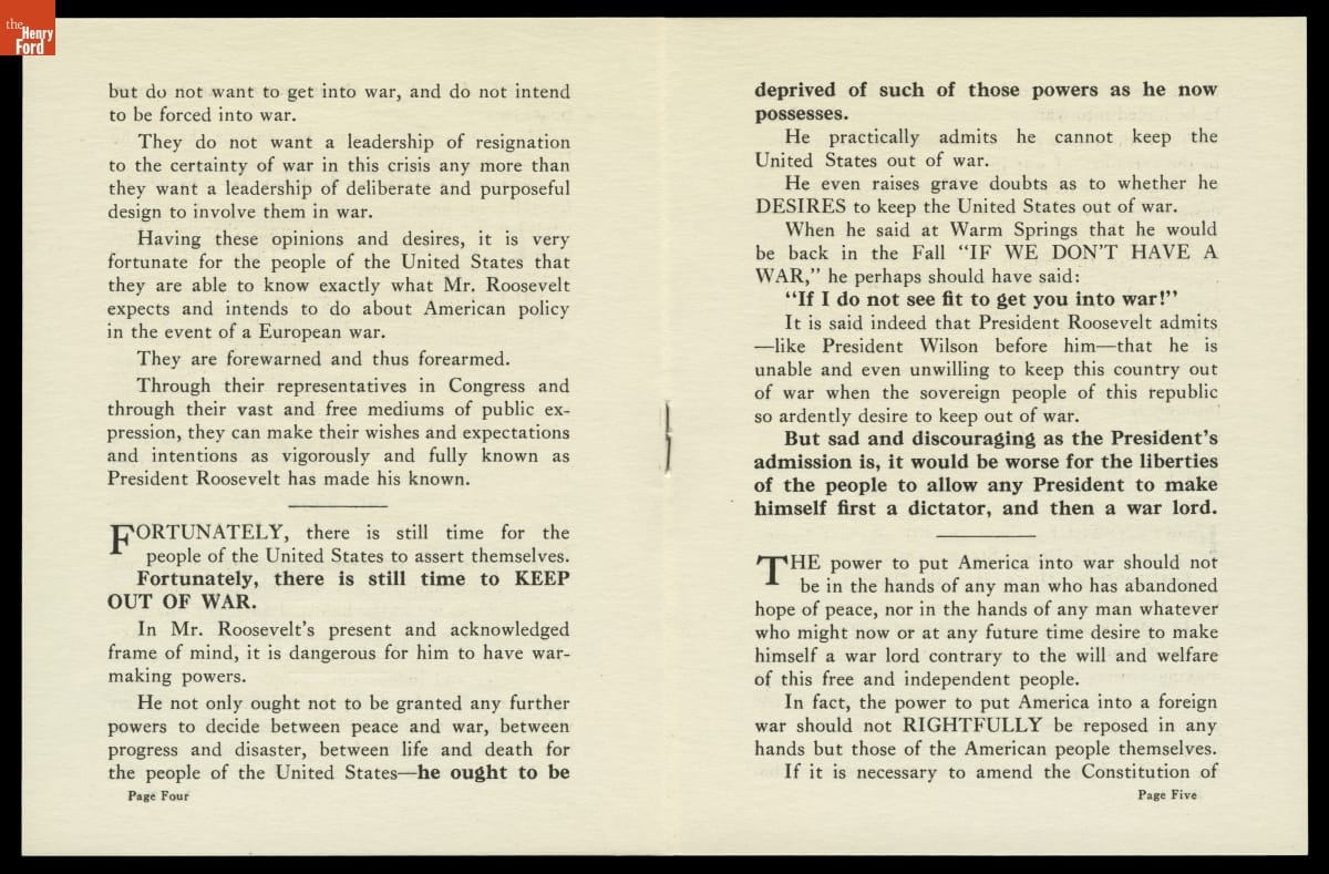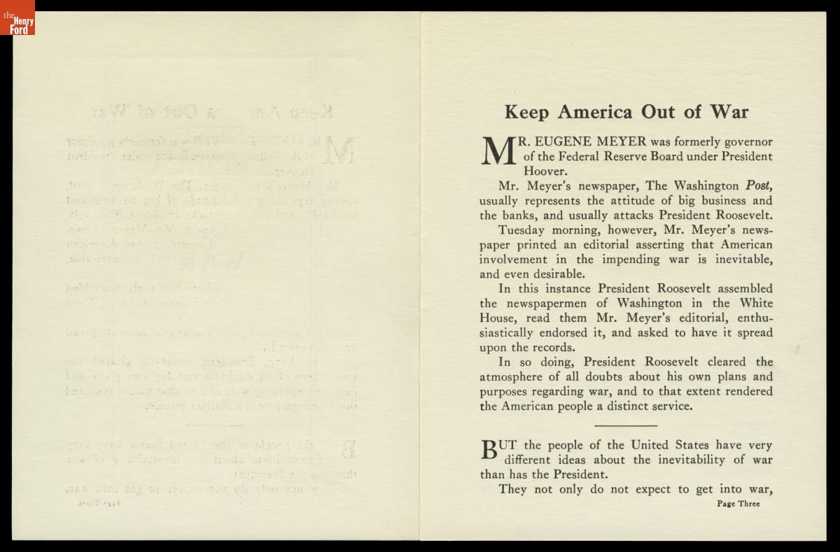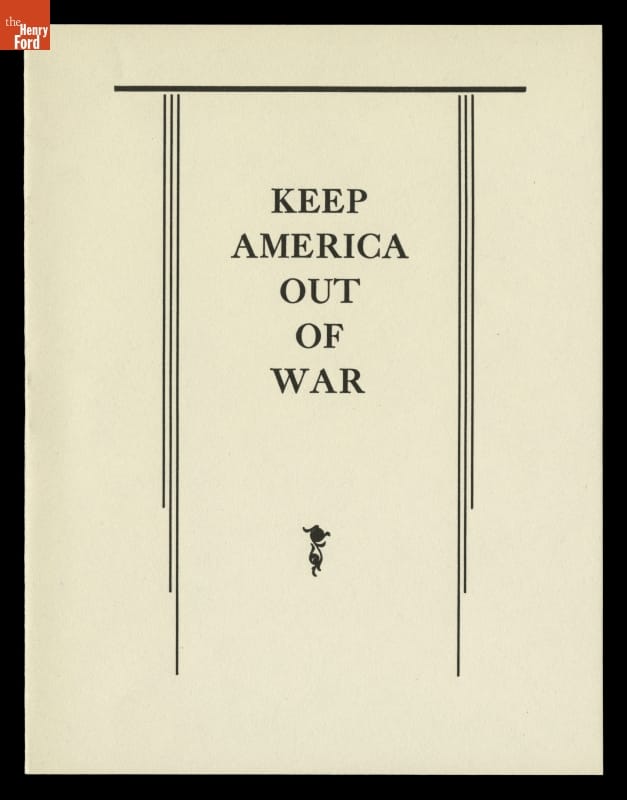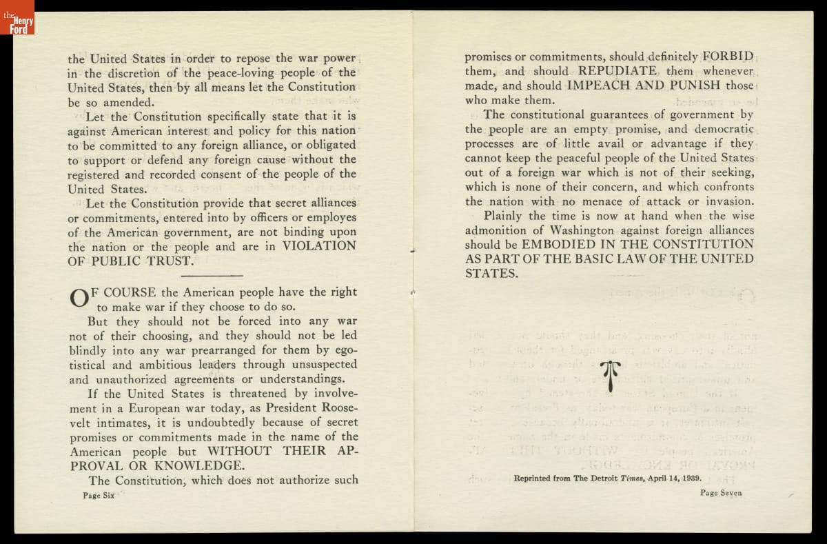 The threat of war in Europe grew throughout the 1930s. This brochure reprinted an anti-war article published in the Detroit Times on April 14, 1939, four and a half months before Nazi Germany invaded Poland and ignited World War II. The article called for an amendment to the Constitution forbidding secret alliances and agreements that could lead to American involvement in foreign conflicts.